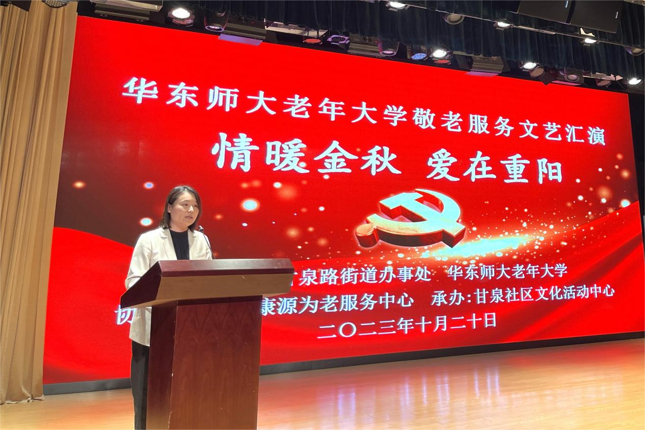 甘泉路街道办事处副主任顾旻娜致欢迎辞。华东师大老年大学常务副校长裴建华在致辞中首先感谢甘泉路街道办事处、上海善康源为老服务中心以及街道社区文化活动中心的大力支持。为庆祝中国共产党第二十次全国代表大会胜利召开,讴歌党的辉煌历程、赞颂党的伟大领导,华东师大老年大学师生在重阳节来临之际,精心策划文艺演出,抒发对党和祖国的热爱之情,表达对社区老年朋友的关爱之心。