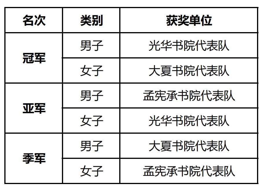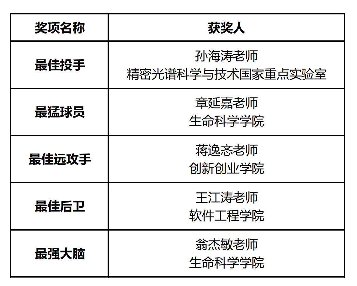 经过激烈的赛事,最终,体育与健康学院2队(交流生)、心理与认知科学学院1队荣获一等奖,经济与管理学院5队、孟宪承书院1队、教育学部2队、化学与分子工程学院、体育与健康学院1队荣获二等奖,教育学部1队、地理科学学院、经济与管理学院2队、统计学院、传播学院荣获三等奖,教育学部、孟宪承书院、经济与管理学院、心理与认知科学学院、体育与健康学院、化学与分子工程学院荣获“优秀组织奖”。