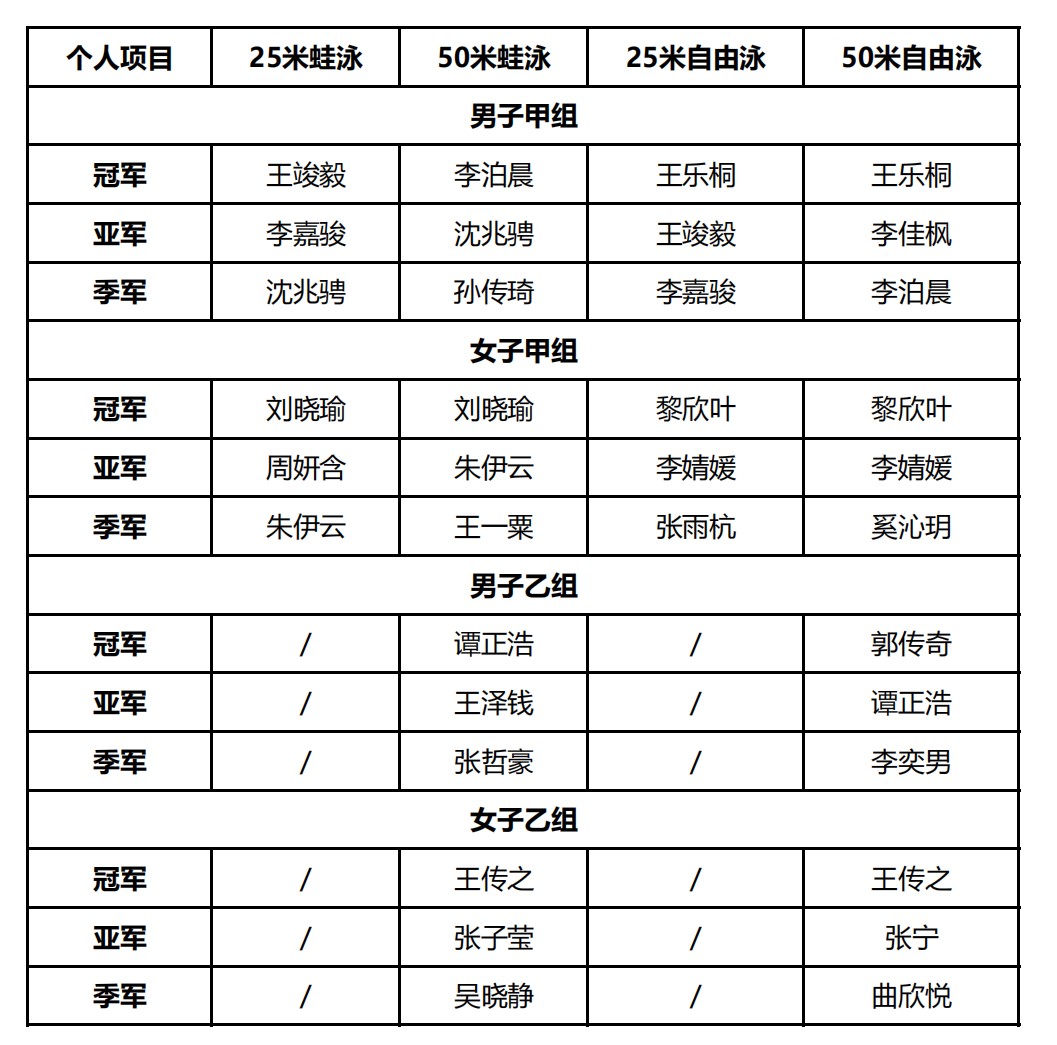 参赛运动员们努力发挥自己最好的水平,他们目光坚定,在泳池中振臂向前,展现出无尽青春活力。他们怀着对游泳项目的热爱,精神饱满,争相竞逐,场馆内同学们热情如火,喝彩不断,呐喊声与加油声此起彼伏。在无比热烈的氛围中,选手们“泳”往直前,在不断溅起的水花中,展现自己拼搏奋进的精神风貌。王乐桐、王竣毅、刘晓瑜、黎欣叶、李泊晨等同学分别荣获各项个人赛冠军。
