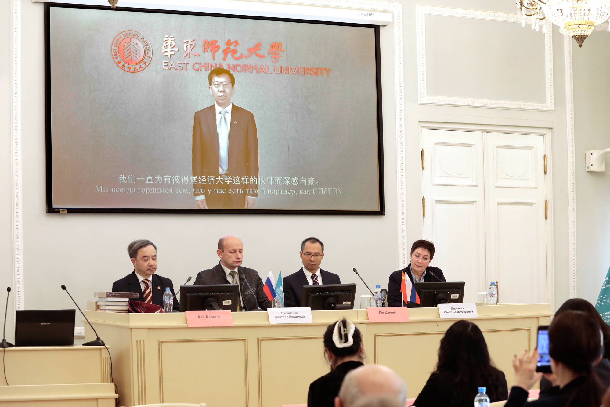 揭牌仪式后,两校联合举办了以“新时代深化中俄全面战略协作伙伴关系”为主题的研讨会和中俄青年圆桌论坛。在研讨会上,华东师大俄罗斯与欧亚研究院院长曲文轶教授作《当前中俄经贸合作的机遇与问题》主题报告、哈萨克斯坦研究中心主任王海燕副教授作《“一带一路”倡议下的中俄经济走廊合作》主题报告,圣彼得堡国立经济大学学者也就中俄各领域的关系及合作进行了主题报告,最后华东师大俄罗斯研究中心谢尔盖·布留科夫教授作总结点评。研讨会引起该校师生广泛关注,他们纷纷表示,愿意加强同华东师大的合作,将会积极参加中心举办的活动。