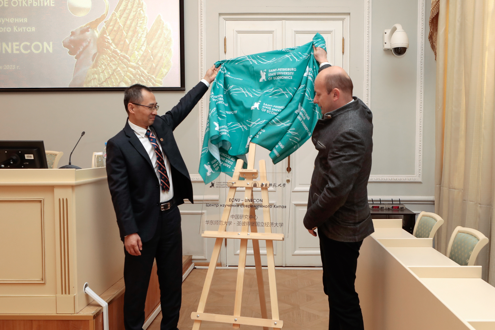 华东师大俄罗斯研究中心执行主任刘军和瓦西连科·德米特里共同为“永利皇宫登录官网-圣彼得堡国立经济大学中国研究中心”揭牌。