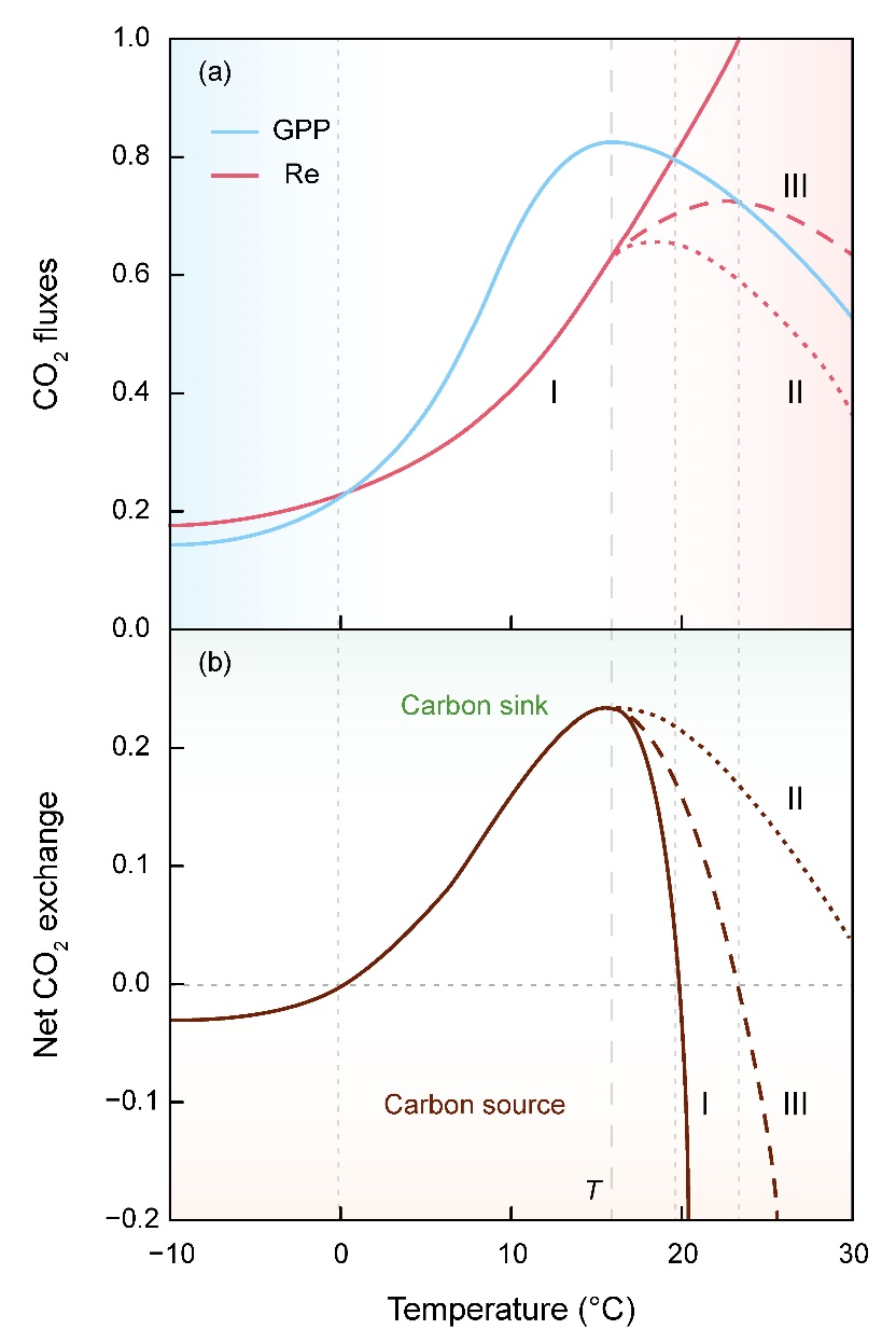图1.生态系统光合作用(GPP)、呼吸作用(Re)(图a)与净生态系统碳交换(NEP)(图b)的理论温度依赖曲线示意图。I、II、III分别对应GPP与Re因果关系的三种假说。I:GPP与Re无因果关系。II:GPP→Re单向因果关系。III:GPP↔Re双向因果关系。