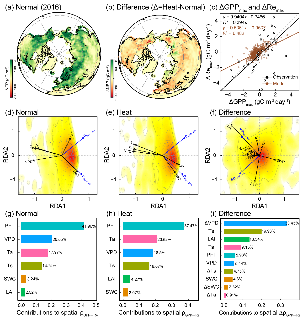 同时,研究团队采用全球陆面模式(Community Land Model Version 5; CLM5)进行了夏季热浪模拟实验,探讨了北半球夏季热浪影响下生态系统光合作用与呼吸作用之间的因果关系及其影响因子。结果表明,全球陆面模式中光合作用与呼吸作用之间同样存在显著的双向因果关系,GPP→Re这一因果关系强度也在热浪胁迫下显著增强(图3)。高温热浪导致的大气饱和水汽压亏缺变化、局地温度和植被属性是∆GPP→Re空间变异的重要解释因子,支持观测结果中的发现。图2.生态系统光合作用(GPP)与呼吸作用(Re)对温度变化的响应(a-b),GPP与Re之间的因果关系检测(c-d)及结果呈现(e-f)。