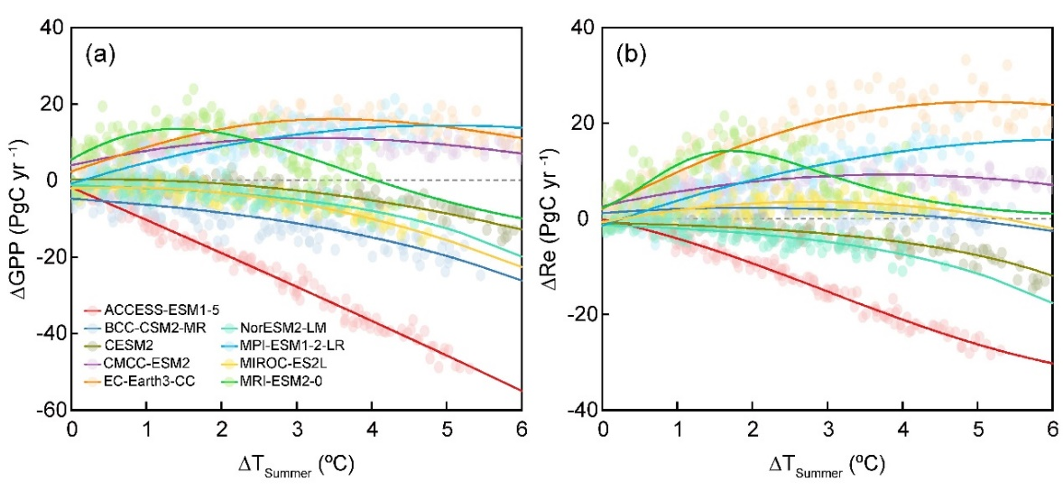 图4.地球系统模型中生态系统光合作用与呼吸作用对夏季温度变化响应的不确定性。