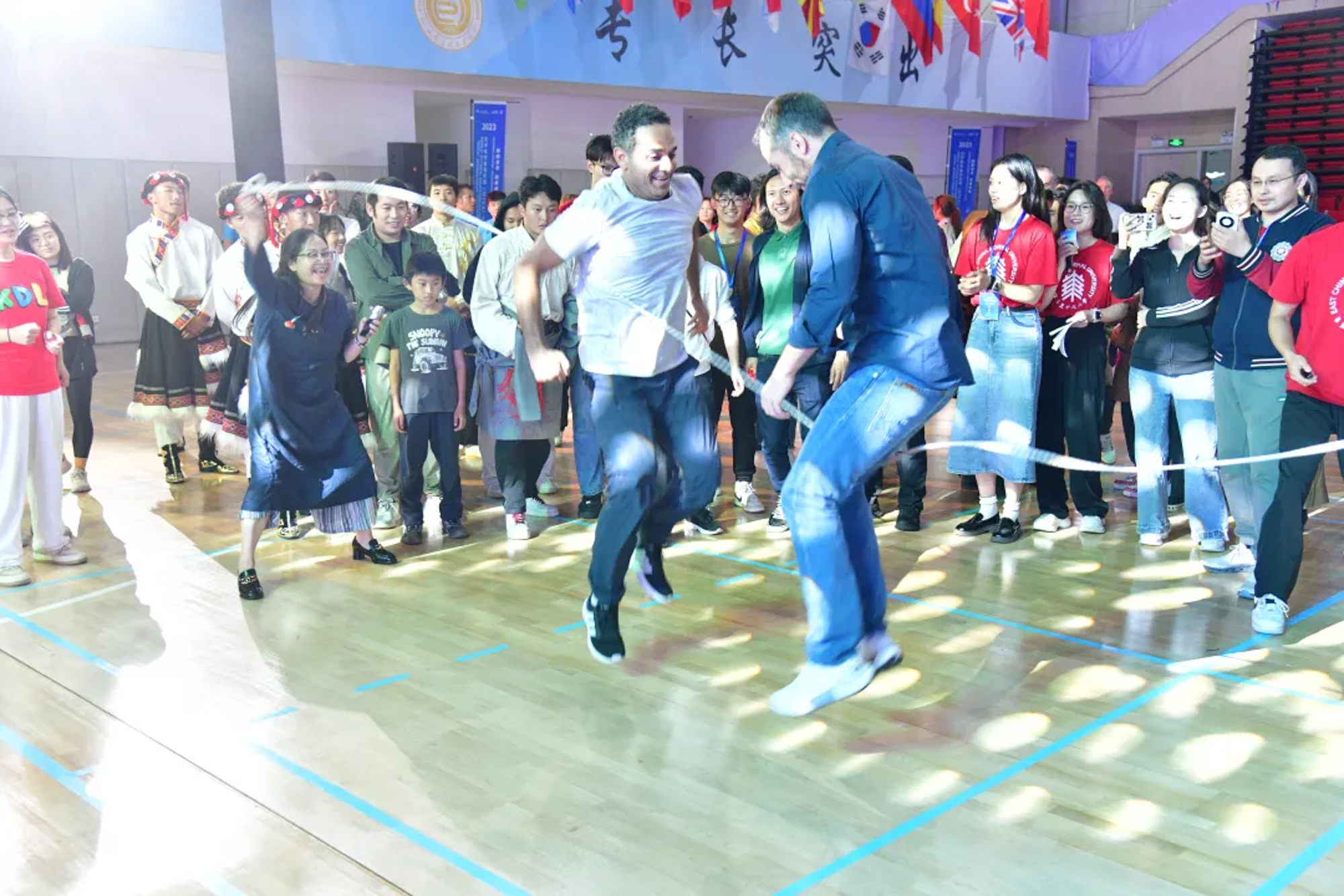 开幕式中,华东师大健美操队的系列中华民族传统风艺术表演为观众带来了一场深入人心的视觉盛宴,展现了中华体育与舞蹈艺术的完美融合;来自徐州的一线体育教师带来了一场极具中华悠久历史和深厚文化底蕴的武术表演,展示了中华武术的博大精深和魅力。Social session环节,太极、舞龙、舞狮、扭秧歌、藏族舞等民族传统体育项目,点燃了国内与会者的民族自信与爱国情怀,帮助国际友人领略了中华传统体育的独特魅力;编花篮、跳皮筋、跳花绳、抖空竹等熟悉而充满欢乐的老游戏,带领国内与会者穿越回了纯真的童年时代,帮助国际友人体验了中华传统体育的乐趣。这些活动极大地丰富了会议内容,让更多国内与会者和更多国际友人深入体验了中华传统体育文化,感悟了丰富的中华历史文化内涵,也进一步推动了世界体育教育的全球化。
