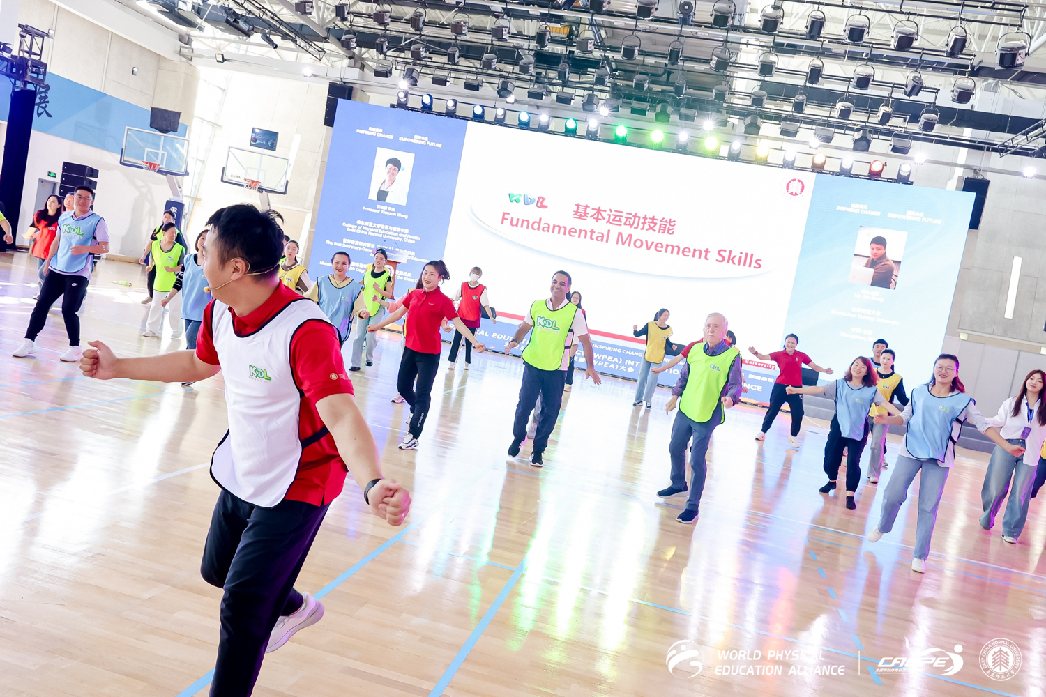Workshop 创新实践环节由汪晓赞教授率领的 KDL 团队呈现,总体内容共分为 KDL 韵律、KDL 课堂常规、KDL 基本运动技能、KDL 专项运动技能、KDL 小学体能和KDL 中学体能六大板块。该环节遵循《课程标准》的主要精神,坚持中国健康体育课程模式的关键要素,遵守儿童青少年动作学习与发展规律,围绕“Know it,Do it,Love it”,设计了一堂趣味化、多样化、综合化的高质量实践课。KDL 团队教师们别出心裁,灵活运用了各式各样的体育运动器材,精心挑选了合适的背景音乐,用生动的语言描述与肢体动作,让与会者们身临其境,帮助与会者在理论中实践、实践中体验、体验中感悟、感悟中深化,部分国外学者也积极加入其中。此刻,中国体育教育的优秀经验向世界展示。