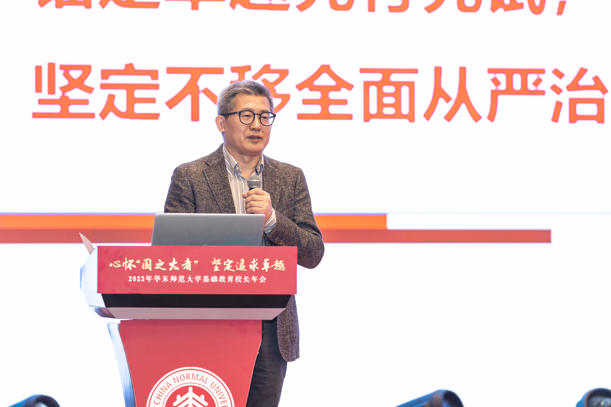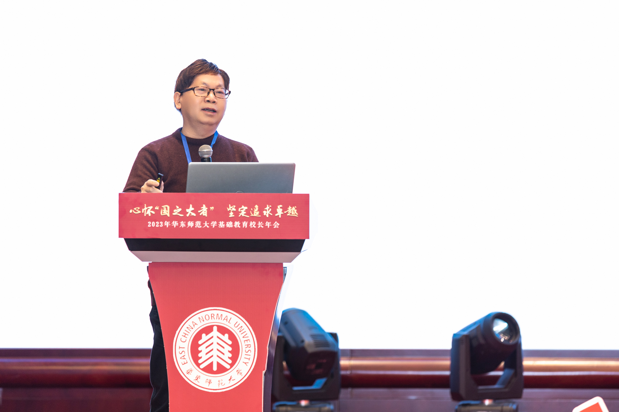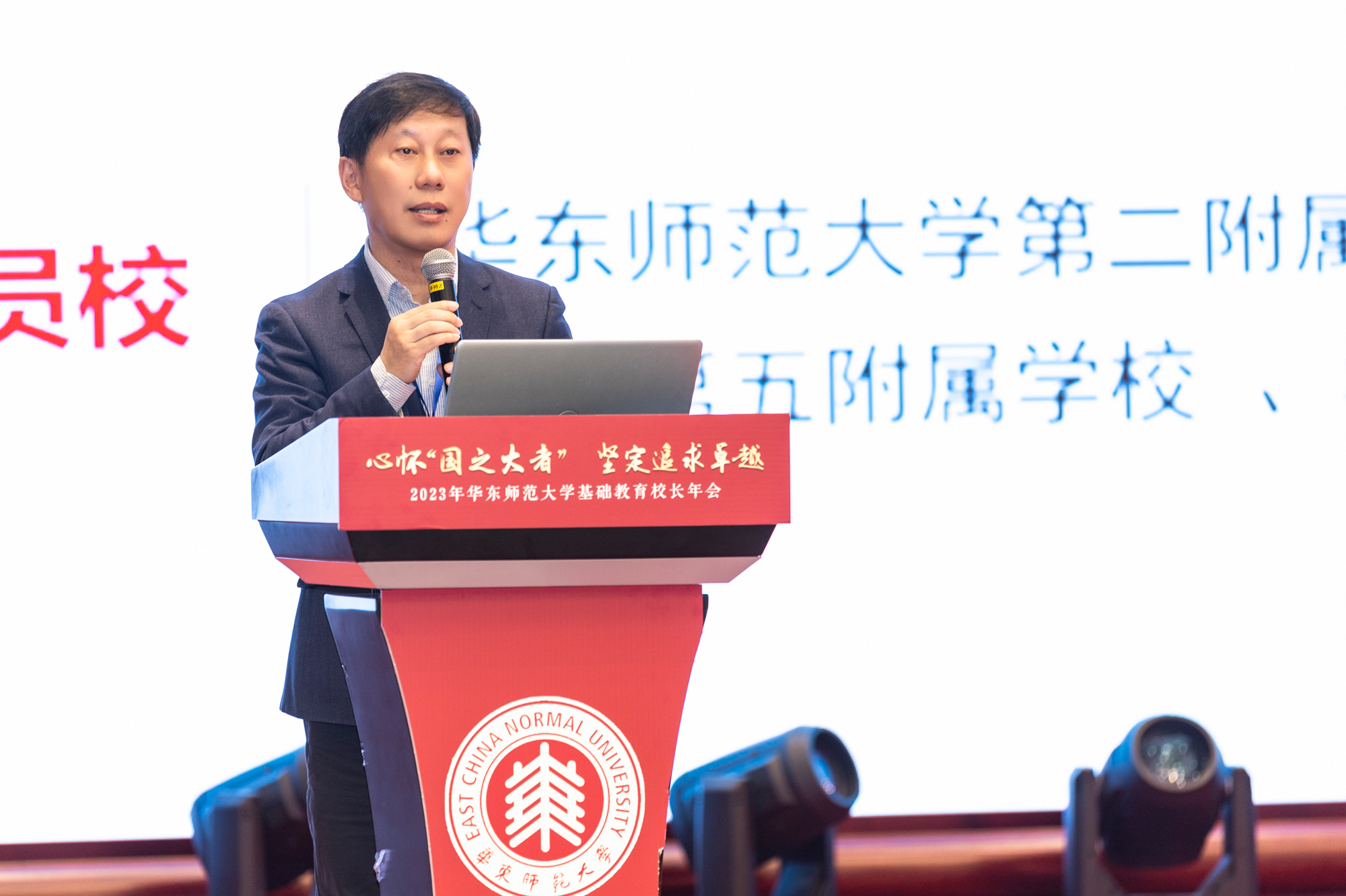 华东师大学术委员会秘书长唐玉光,结合华东师大第十四次党代会会议精神作了题为《加快建设引领育人创新的华东师大基础教育体系》的专题报告,他详细解读了学校第十四次党代会的主题以及学校定位、目标、思路与路径,他表示,学校提出到2035年要建成“引领育人创新的中国特色世界一流大学”,这是学校未来工作的行动指南和前进方向。他指出,华东师大教育集团要以学校发展目标为指引,胸怀大局、把握大势,急国之所需、应民之所盼,积极探索推动基础教育改革与育人创新的“华东师大”模式,构建师大学派,形成师大方案,全面提升华东师大对基础教育高质量发展的支撑力和贡献力。