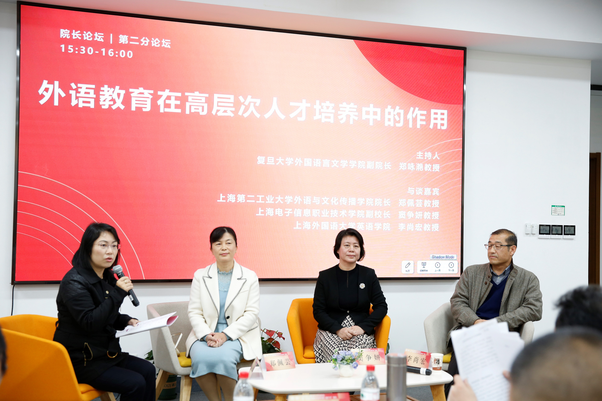 第二分论坛由复旦大学外国语言文学学院副院长郑咏滟教授主持,上海第二工业大学外语与文化传播学院院长郑佩芸教授、上海电子信息职业技术学院副校长窦争妍教授、上海外国语大学英语学院李尚宏教授参与探讨。专家们以“外语教育在高层次人才培养中的作用”为主题,结合人才培养理念、人才培养方法、高等职业教育中外语教学重要性等多个维度展开讨论。