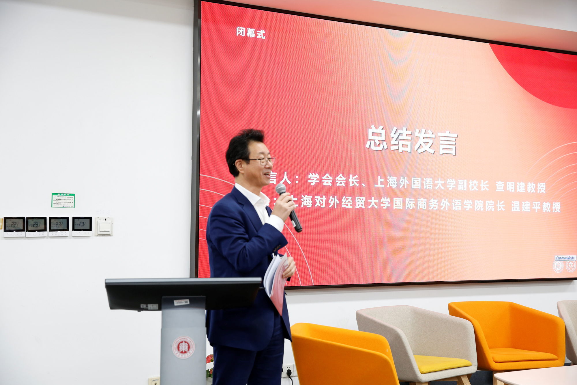 闭幕式由学会会长、上海外国语大学副校长查明建作大会总结发言,上海外文学会副会长、上海对外经贸大学国际商务外语学院院长温建平主持。查明建教授认为,本次研讨会的主题深化了对外语教育与习近平新时代中国特色社会主义思想主义建设密切联系的认识,主旨发言和分论坛访谈对推动上海市及全国高校外语教育新变革、新发展作出了理论与实践的探索和思考。