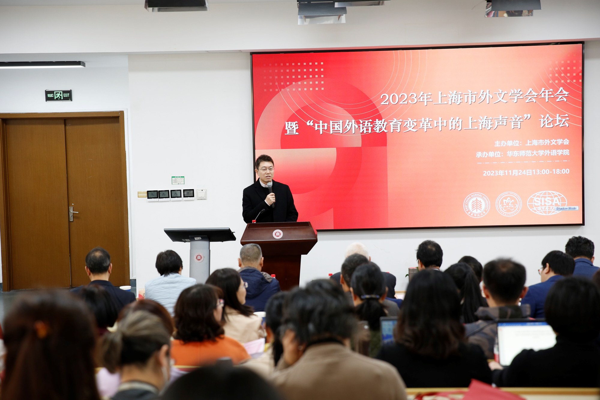 11月24日下午,“2023年上海市外文学会年会暨‘中国外语教育变革中的上海声音’研讨会”在华东师大举办。本次年会由上海市外文学会主办,华东师大外语学院承办。国内外语界专家学者和上海市外文学会会长、副会长及各理事单位的常务理事、理事、教师等200余人齐聚华东师大外语学院。与会专家学者就“外语人才培养与外语教学改革”“外语教育在教育强国战略中的定位”“外语教育变革的方向与目标”等主题开展热烈讨论。大会开幕式由学会副会长、永利皇宫登录官网外语学院院长兼党委副书记杨延宁以及学会副会长、《当代外语研究》主编杨枫共同主持。