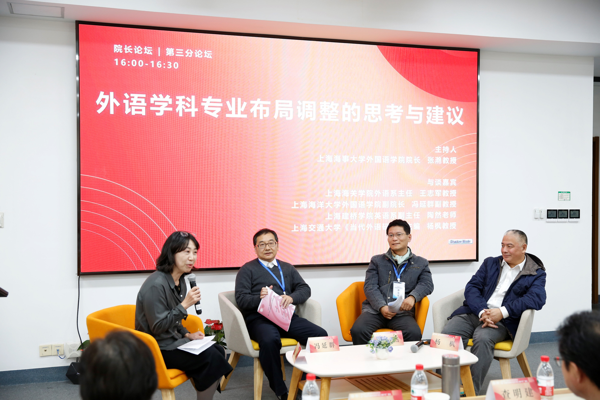 第三分论坛由上海海事大学外国语学院院长张滟教授主持,与谈嘉宾有上海海洋大学外国语学院副院长冯延群副教授、上海建桥学院英语系副主任陶然老师、《当代外语研究》主编杨枫教授。专家们围绕“外语学科专业布局调整的思考与建议”主题,探讨了特色学科建构、外语专业布局与分类、外语学科与外语专业的内涵等问题。