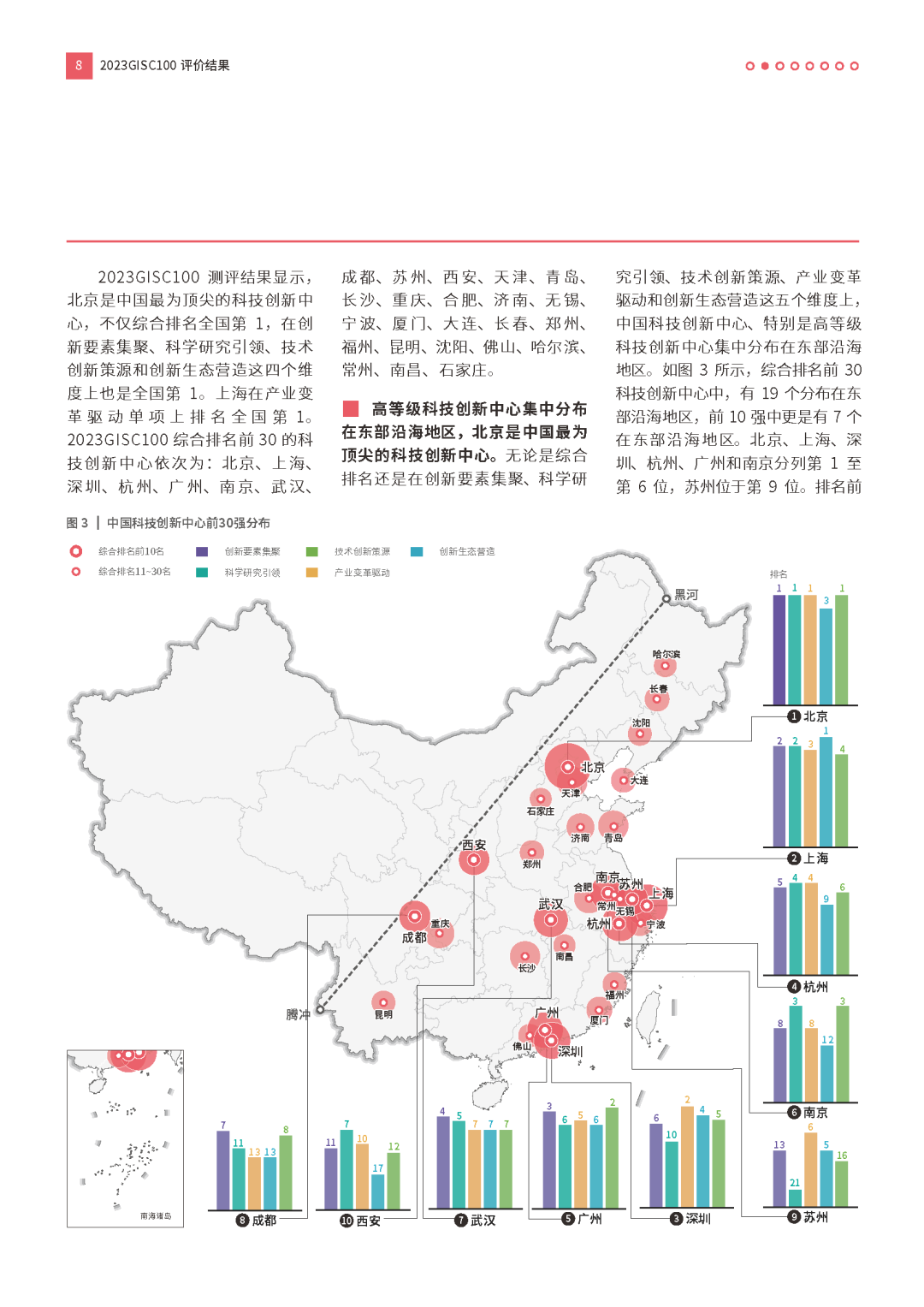 综合排名全国前100的科技创新中心中,有78个位于东部沿海和长江经济带,前30强中更是有24个位于上述两大地带。