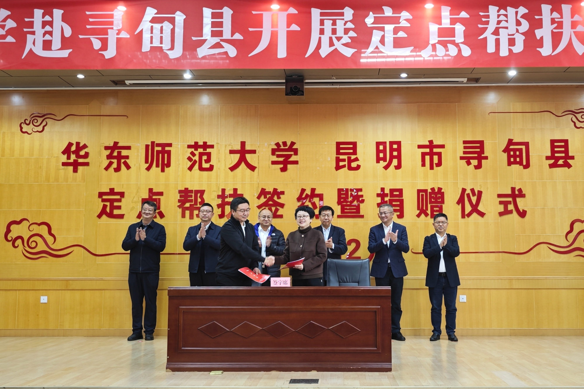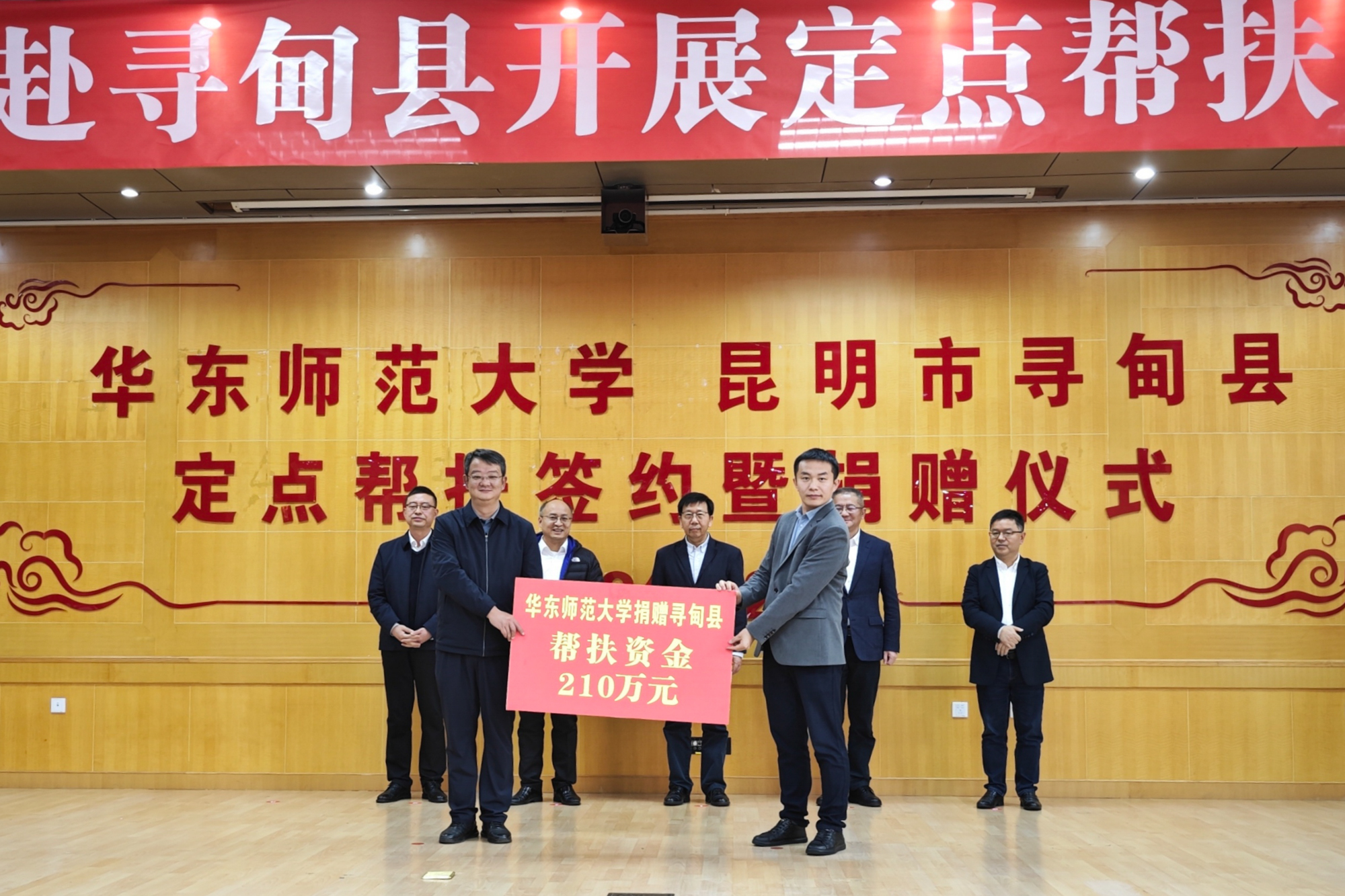 座谈会上,华东师大学校办公室副主任、合作交流办公室主任李彦垒代表学校向寻甸县捐赠210万元,寻甸县委副书记、县长普靖代表寻甸县接受捐赠;华东师大工会常务副主席房建军与寻甸县供销社签订了农副产品采购协议。
