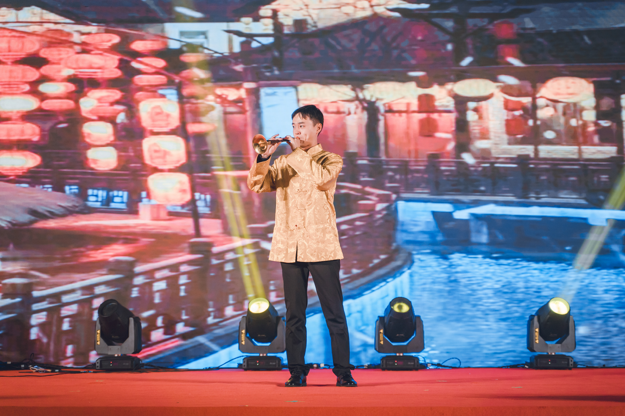 唢呐独奏《闹雪灯》通过粗犷、奔放的旋律描绘出在元宵节时人们争相上街、观看花灯的热闹情景,同时通过轻快柔美的旋律给人们展示出一幅家家户户欢度佳节、阖家幸福的喜悦画卷。