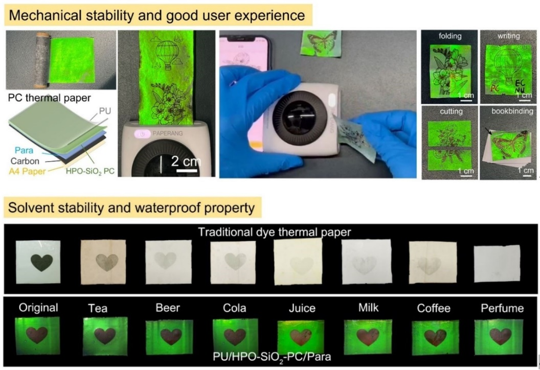 化学与分子工程学院葛建平教授团队,利用石蜡、胶体、聚氨酯在纸质基材上的层层堆叠,开发出防水稳定可剪裁的光子晶体热敏纸,解决了传统材料遇水褪色的难题。该材料兼容全固态便携式热敏打印机,能够利用一步印刷过程,快速获得具有276DPI分辨率、6级灰阶的结构色图案,为绿色化热敏印刷提供成熟的技术方案。相关成果在线发表在材料学领域顶尖学术期刊Advanced Materials上。