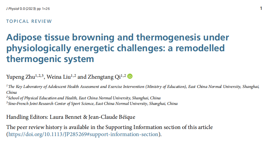 体育与健康学院漆正堂课题组在著名英国生理学期刊Journal of Physiology发表TOPICAL REVIEW文章,从颤抖和非颤抖产热系统之间的互补关系出发,提出了机体产热模式的新见解,即能量挑战下的脂肪非颤抖产热增强会伴随骨骼肌颤抖产热减弱,并从能量稳态角度阐述了脂肪白化和棕色化过程。这一生理功能的转变是为了更经济地利用能源物质,赋予机体更强的适应能力,尤其是在骨骼肌工作需要加强的运动条件下。2022级硕士生朱钰鹏为本文第一作者,漆正堂博士为通讯作者。