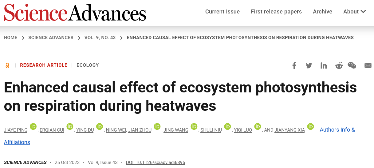 相关成果以Enhanced causal effect of ecosystem photosynthesis on respiration during heatwaves为题在国际学术期刊Science Advances在线发表。夏建阳教授为通讯作者,博士生平佳烨为第一作者。