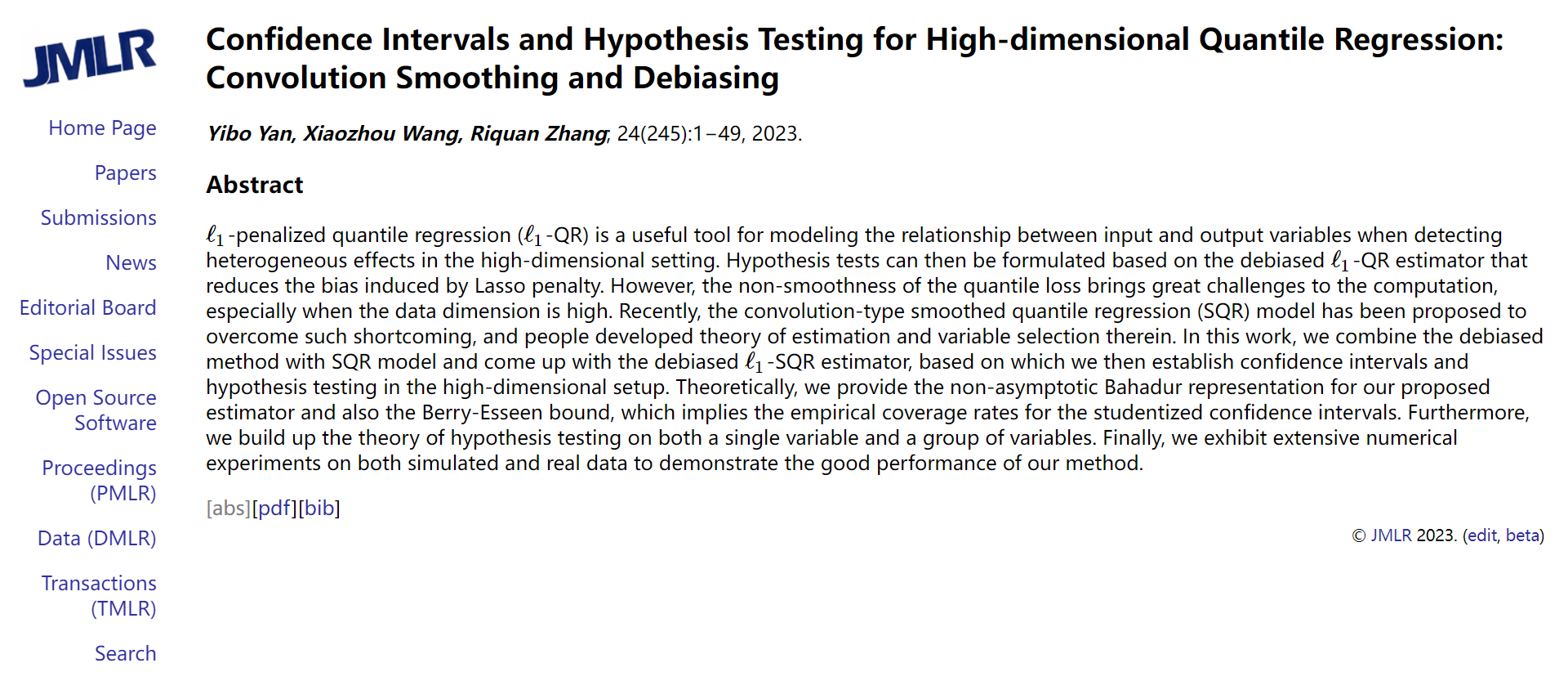 回归分析是数据研究的重要工具,然而一些常见的回归问题具有非光滑性等特点,为计算和理论分析带来诸多挑战,尤其是处理大规模数据。本工作针对高维分位数回归模型,创新性地将纠偏方法结合卷积型光滑化技术应用于模型,提出新的纠偏估计并提供完备的统计推断结果,相比已有研究实现了计算与理论方面的突破。相关研究成果发表在机器学习顶级期刊Journal of Machine Learning Research。