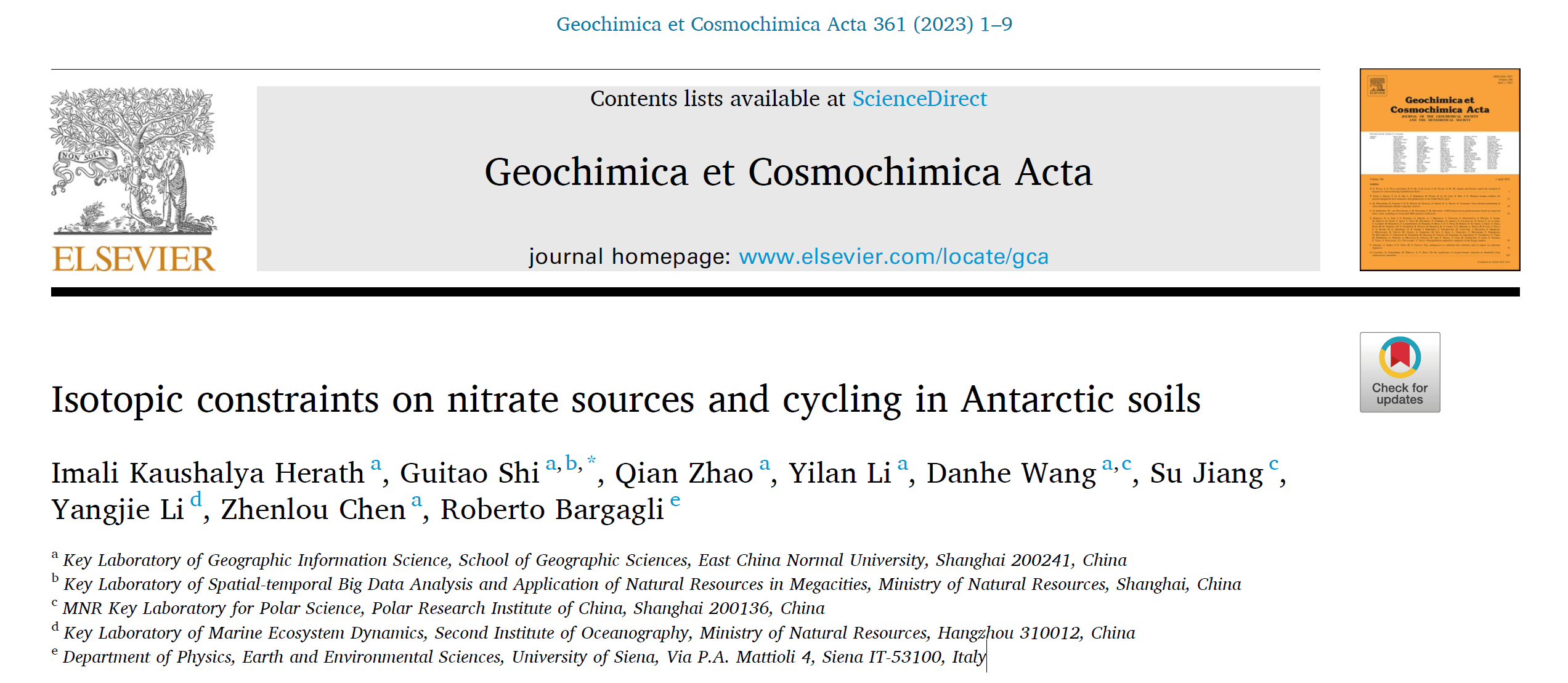 硝酸盐对维持生态系统起着重要作用,但其在极地陆地生态系统中的来源和循环过程仍不清晰,同时极地氮循环过程对全球气候变化的响应认识仍非常有限。地理科学学院史贵涛团队领衔与University of Siena合作,研究了南极不同区域土壤硝酸盐的同位素组成,定量了大气沉降和微生物来源硝酸盐的贡献量,揭示了在土壤中存在活跃的氮循环过程,同时发现全球变暖可能会显著影响极地氮循环过程。成果发表在地球化学核心期刊Geochimica et Cosmochimica Acta(Nature Index)上。
