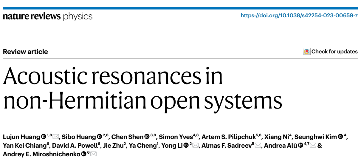 相关成果以Acoustic resonances in non-Hermitian open systems为题在知名期刊Nature Reviews Physics在线发表,黄陆军研究员为论文的共同一作和联合通讯作者。