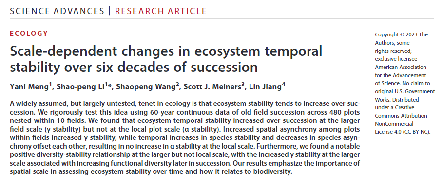 经典演替理论认为,随着演替的进程,生态系统的稳定性逐渐提高。这一观点被广泛写入生态学教科书中,并已成为生态恢复的指导思想。生态与环境科学学院黎绍鹏教授团队利用全球历时最长的弃耕地次生演替连续监测序列,揭示了只有在大的空间尺度上才能检测出稳定性随演替显著增加的趋势,而在小尺度上演替后期生态系统并未趋于稳定,进而修正了“生态系统稳定性总是随演替进程逐渐提高”的传统观点。