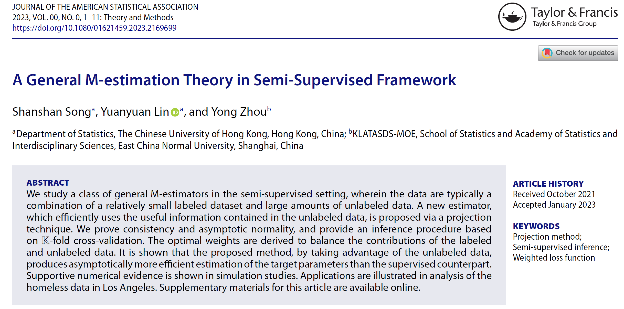 针对半监督数据提出了一类广义的M估计方法,这里半监督数据是由相对较小的标签数据集和大量无标签数据组合而成的。通过投影技术,周勇教授团队提出了一种新的估计方法,它有效地利用了无标签数据中包含的有用信息,证明了所提出估计量的相合性和渐近正态性,并提供了基于K折交叉验证的统计推断理论。同时推导出了用于平衡标签数据和无标签数据贡献的最优权重。通过利用无标签数据,得到了比只用有标签数据更有效的估计。相关成果发表在国际统计学顶级期刊Journal of the American Statistical Association。