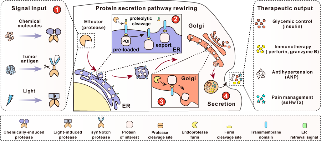 现有的定制细胞对治疗蛋白的表达局限于转录或翻译水平的调控,无法满足对有即时用药需求的疾病治疗。针对这一问题,生命科学学院、上海市调控生物学重点实验室、医学合成生物学研究中心叶海峰研究团队通过重编程蛋白质分泌途径,开发了一个精准可控的蛋白质快速释放技术平台PASS系统。通过调控不同蛋白药物的快速释放,研究人员在多种疾病小鼠中实现了分钟级别的快速降糖、降血压以及镇痛的效果。这一创新成果A programmable protease-based protein secretion platform for therapeutic applications发表在国际期刊Nature Chemical Biology。