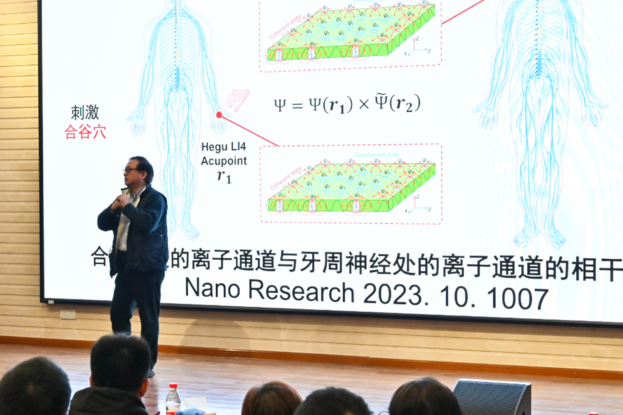 江雷院士首先从中国古代哲学“道法自然”的思想开始谈起,结合对电鳗放电等生命科学现象的研究,生动地揭示了生命整体离子通道同频共振宏观量子态的形成机制、外部周期场对生命信息系统的调制以及生物信息的储存/输出模式等。通过空间限制决定人类有序活动的生活案例,江雷院士形象地阐述了微观结构中的粒子有序现象,提出了基于量子限域超流体的有序组装反应过程,介绍了量子限域超流体的研究进展,引发师生的深入思考。随后,江雷院士又以已被证实的合谷穴(世界卫生组织ID代码:LI4)与牙周神经的关系为例提出,量子经络诱导的穴位刺激与生理功能之间存在相互作用;人体的不同部位是由经络的宏观量子相干态连接起来的,通过刺激穴位,相应器官的症状可以借助经络的量子态得到调节。