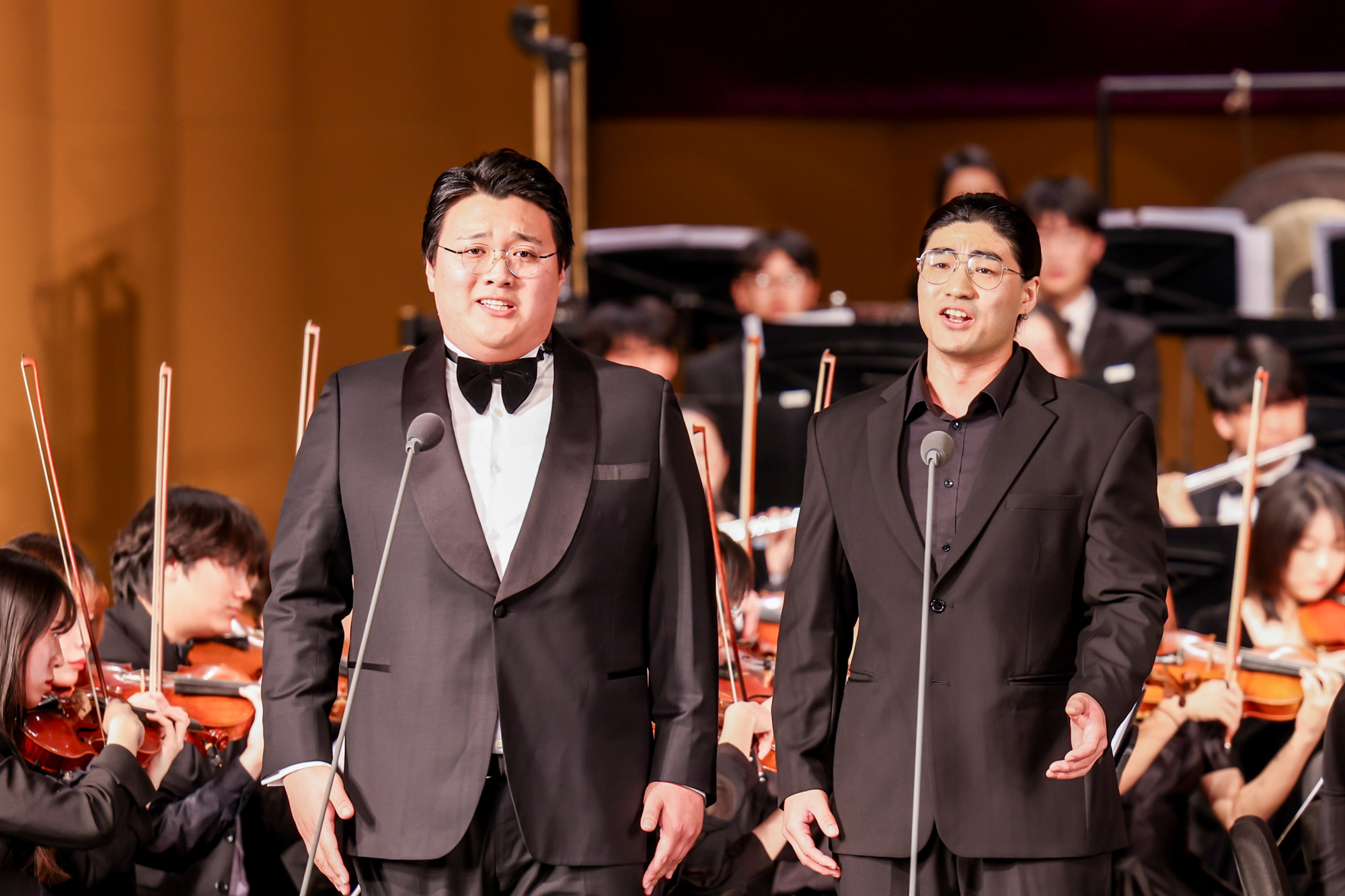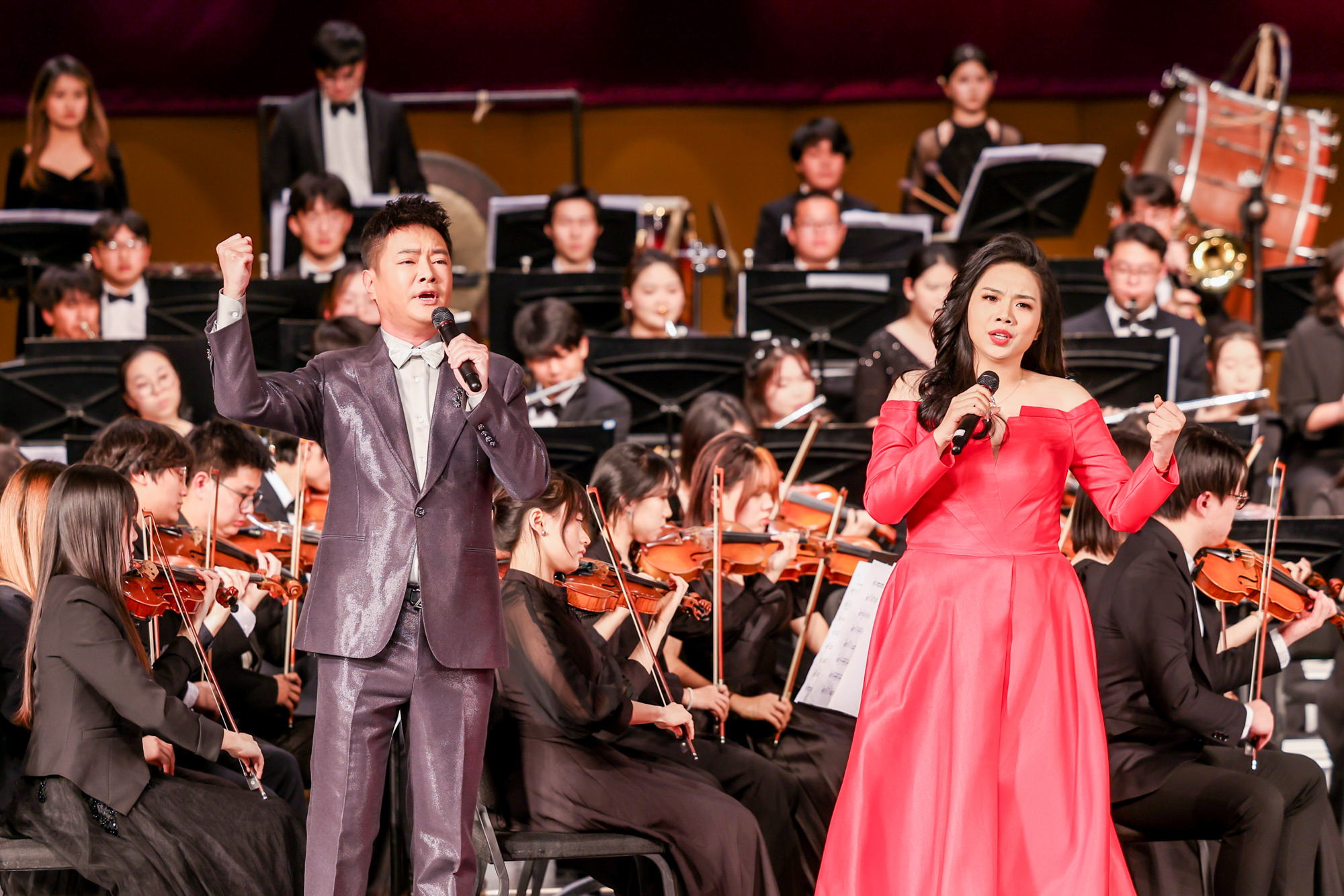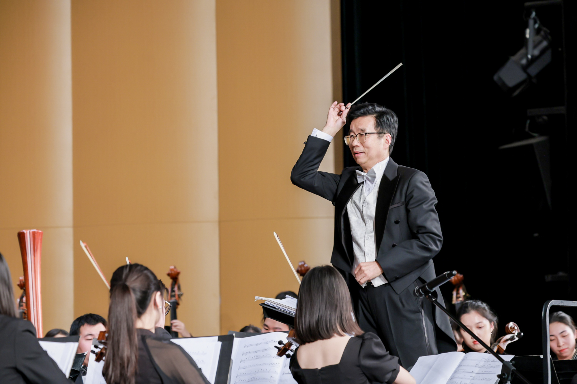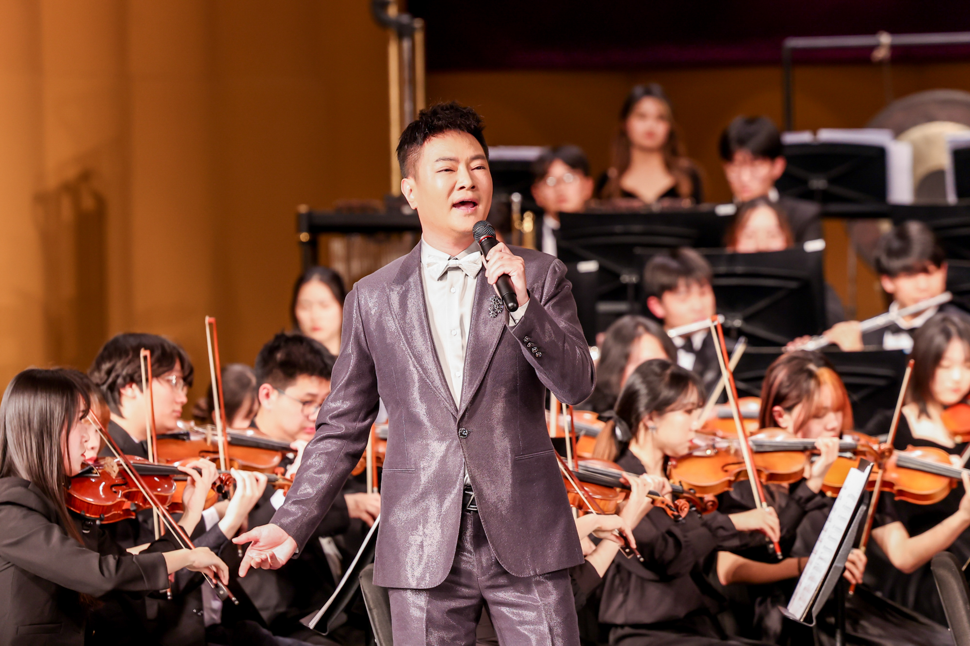 管弦乐《春节序曲》《节日组曲》奏响耳熟能详的节日旋律,拉开音乐会序幕;音乐学院2022级声乐表演与教学专业研究生吴晨希以一首《我们的生活充满阳光》唱出青年追逐理想的激情;管弦乐《复兴序曲》用音符描绘祖国的壮美山河,展现祖国现代化新征程的宏伟篇章;由音乐学院器乐系主任、硕士生导师汤芷诺演奏的《哈恰图良长笛协奏曲》,将朝气蓬勃的快板同抒情的慢板相结合,将人们带入音乐的乌托邦;管弦乐《大河之舞》带我们领略了爱尔兰的异域风情;音乐学院2023级声乐表演与教学硕士生张霆轩、2022级声乐表演本科生李星辰献唱《在殿堂深处》,音乐学院键盘系主任、硕士生导师谢承峯教授演奏《拉赫玛尼诺夫第二钢琴协奏曲》,为观众展现古典音乐的生动魅力;管弦乐《世间始终你好》、华东师大客座副教授汤非独唱《鸿雁》、汤非及音乐学院声乐教师高凌媛二重唱《不忘初心》,或激昂大气,或缱绻旖旎,引发了观众的热烈掌声;最后,在上海师范大学音乐学院指挥副教授、硕士生导师王瑾和永利皇宫登录官网音乐学院副教授、硕士生导师谭雅如的指挥下,上海高校校长合唱团、永利皇宫登录官网华韵合唱团共同演绎《四渡赤水出奇兵》《国家》两首歌曲,用最宏大澎湃的旋律,为音乐会画上圆满的句号。