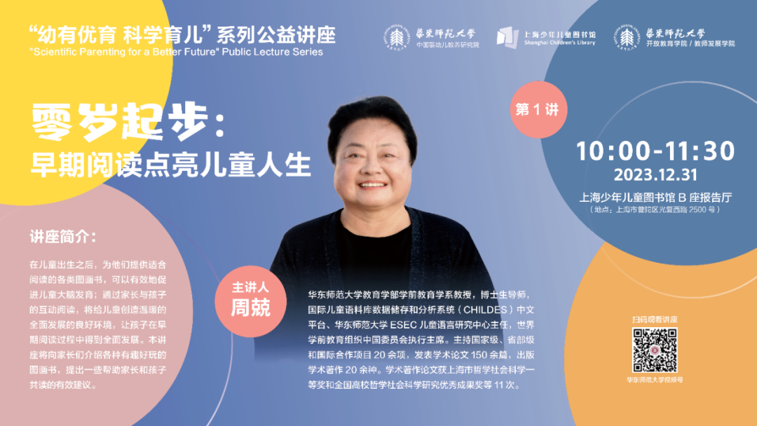 12月31日上午,首场讲座“零岁起步:早期阅读点亮儿童人生”由知名儿童早期阅读研究专家周兢教授在上海少年儿童图书馆(长风馆)开讲。