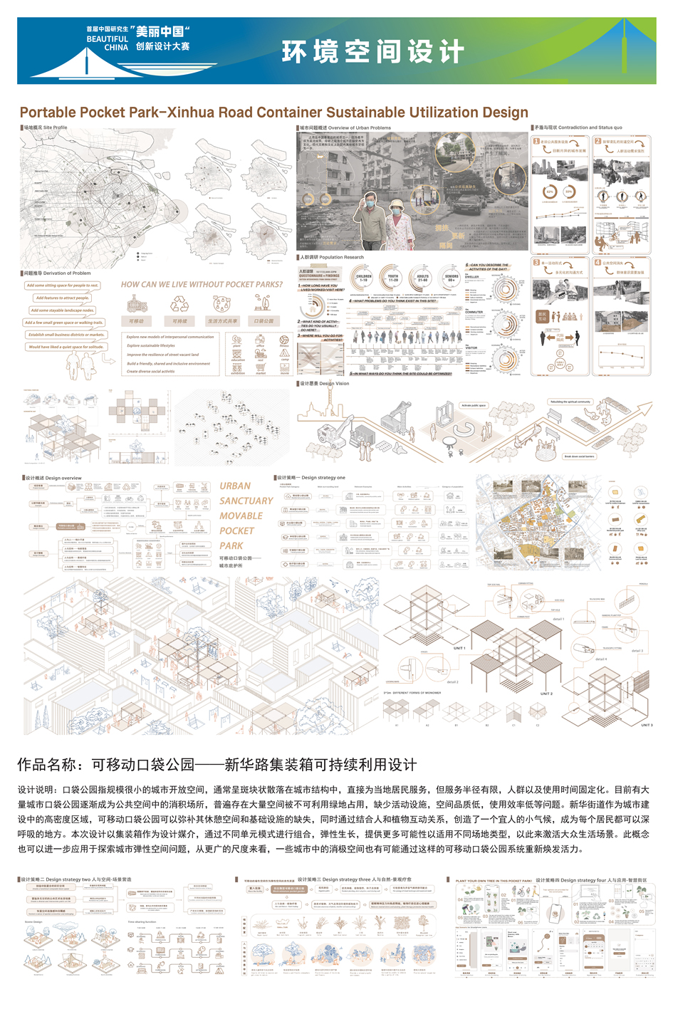 同样获得三等奖的“设计少女先疯队”团队作品《可移动口袋公园——新华路集装箱可持续利用设计》作品以集装箱作为设计媒介,在新华路街道所辖地块进行探索实践,通过不同单元模式进行组合,弹性生长,提供更多可能性以适用不同场地类型,以此来激活大众生活场景。