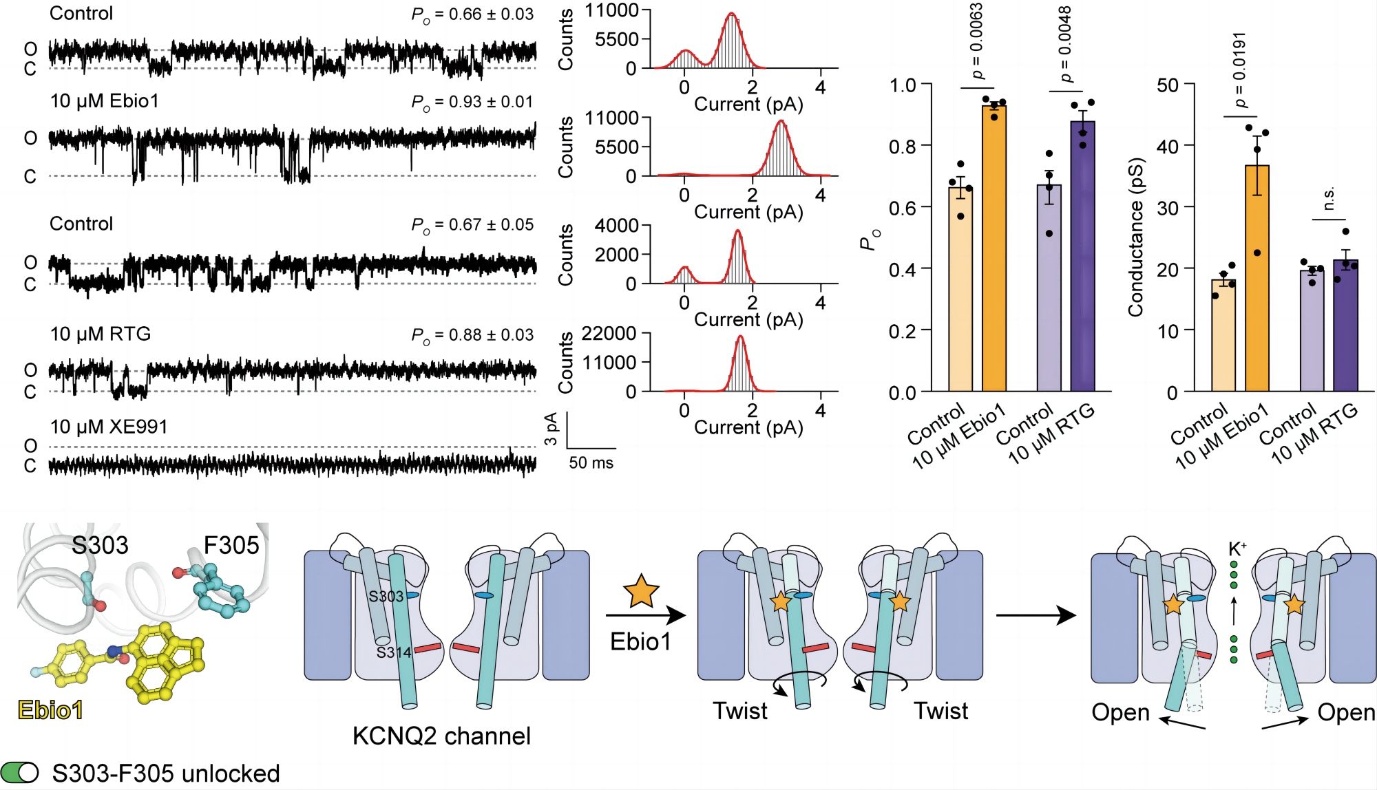 表征离子通道的开放态状况通常可用开放概率和电导两个参数表征。外源性离子通道激动剂通常是稳定离子通道开放态,增加开放态的概率,而不改变电导。电压门控钾离子通道KCNQ2及KCNQ2/3异聚体是抗难治性癫痫和渐冻症等重大疾病的潜在靶标,受到制药工业界广泛关注。研究人员通过计算机辅助药物设计发现KCNQ2及KCNQ2/3的新型小分子激动剂Ebio1。电生理实验显示该小分子发挥特殊激动作用,能增加通道的电导。结合冷冻电镜、突变、分子模拟和小分子衍生物探针等手段,研究人员进一步揭示Ebio1是通过破坏S303侧链和F305主链羰基氧之间的作用,驱动构成孔道的S6螺旋发生扭曲打开(twist-to-open)运动,从而使得通道孔道区开放至新型开放状态。