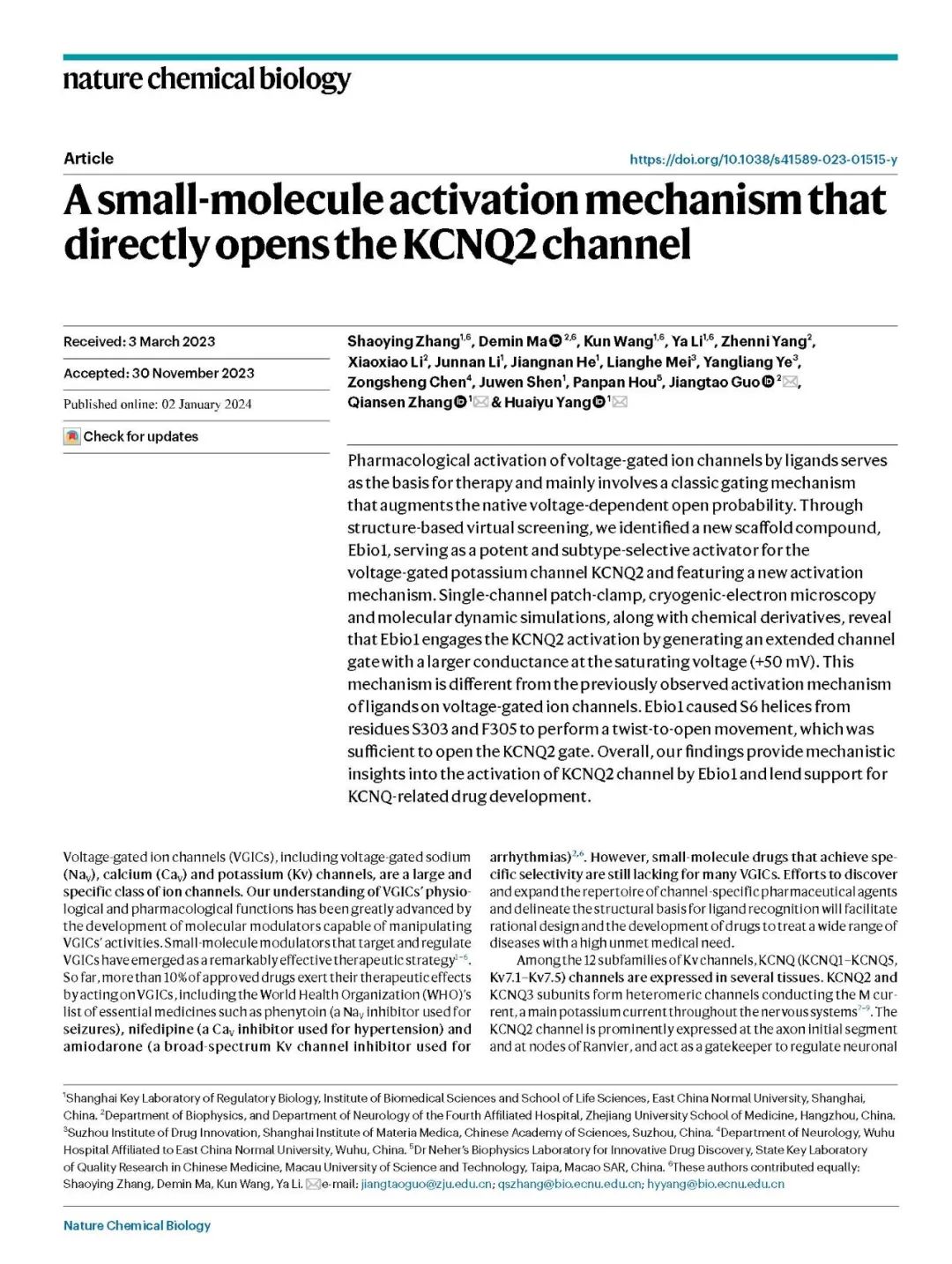 永利皇宫登录官网生命科学学院阳怀宇课题组持续构建离子通道新调控理论,提出“靶向中间态”和“配体-离子直接作用”等非经典调控机制,为离子通道药物设计奠定基础。近日,该团队与浙江大学基础医学院郭江涛课题组合作,揭示了小分子直接打开孔道区的新型调控机制,研究结果于2024年1月2日以"A small-molecule activation mechanism that directly opens the KCNQ2 channel" 为题在线发表于 Nature Chemical Biology 杂志。