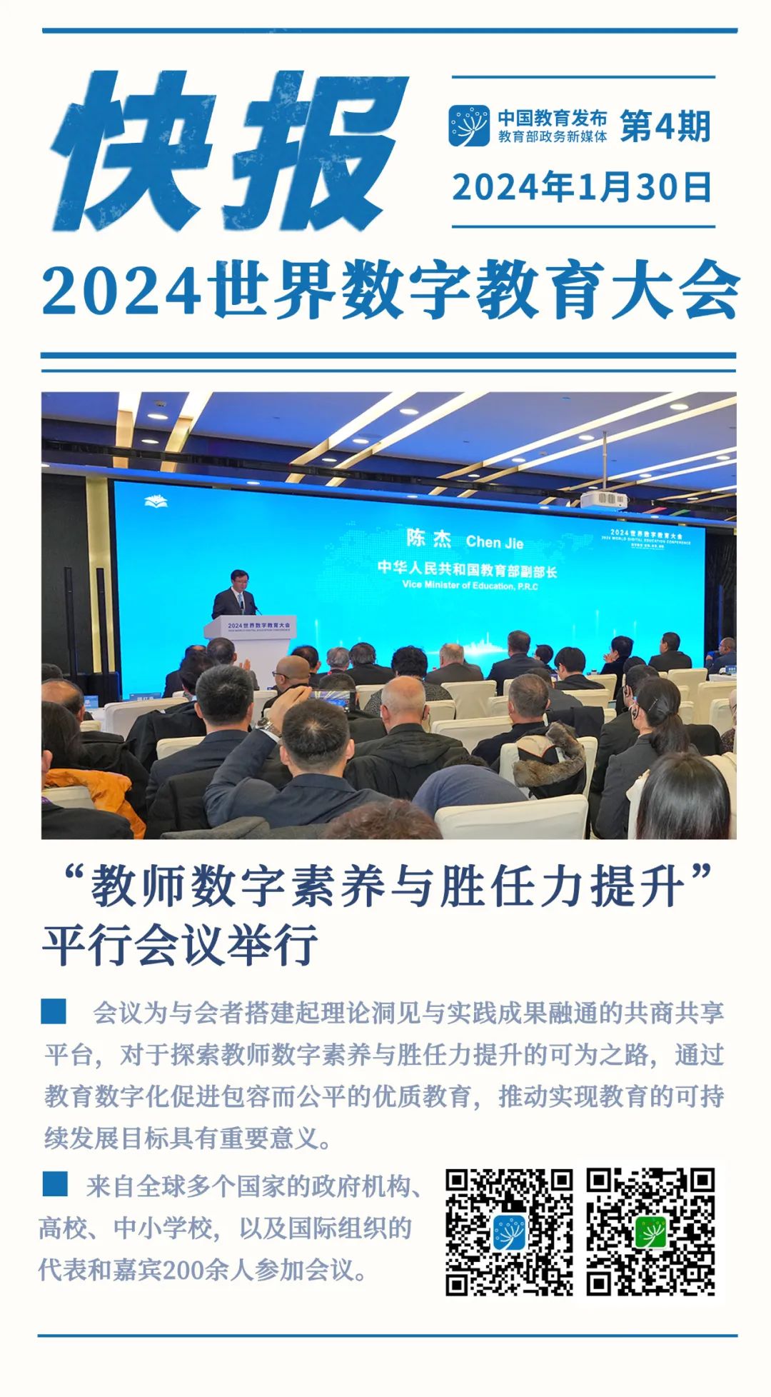 1月30日,2024世界数字教育大会平行会议一“教师数字素养与胜任力提升”在沪举行。中国教育部副部长陈杰、佛得角共和国教育部部长阿玛杜·克鲁斯、库克群岛政府教育部长瓦因·莫科罗亚、保加利亚教育与科学部副部长玛瑞埃塔·吉欧艾娃、土库曼斯坦教育部副部长阿扎特·阿塔耶夫、乌兹别克斯坦教育发展科学与方法中心主任瓦希德·哈米多夫、上海市委副秘书长燕爽、永利皇宫登录官网党委书记梅兵出席开幕式,开幕式由教育部教师工作司副司长黄小华主持。