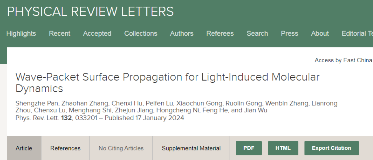 研究成果于2024年1月17日以“Wave-Packet Surface Propagation for Light-Induced Molecular Dynamics”为题发表在Physical Review Letters上。该课题由永利皇宫登录官网吴健教授团队和上海交通大学何峰教授团队合作完成,吴健教授为论文的通讯作者,永利皇宫登录官网博士研究生潘晟哲为论文第一作者。该工作获得国家重点研发计划、国家自然科学基金委、上海市科委、永利皇宫登录官网科技项目的支持与资助。