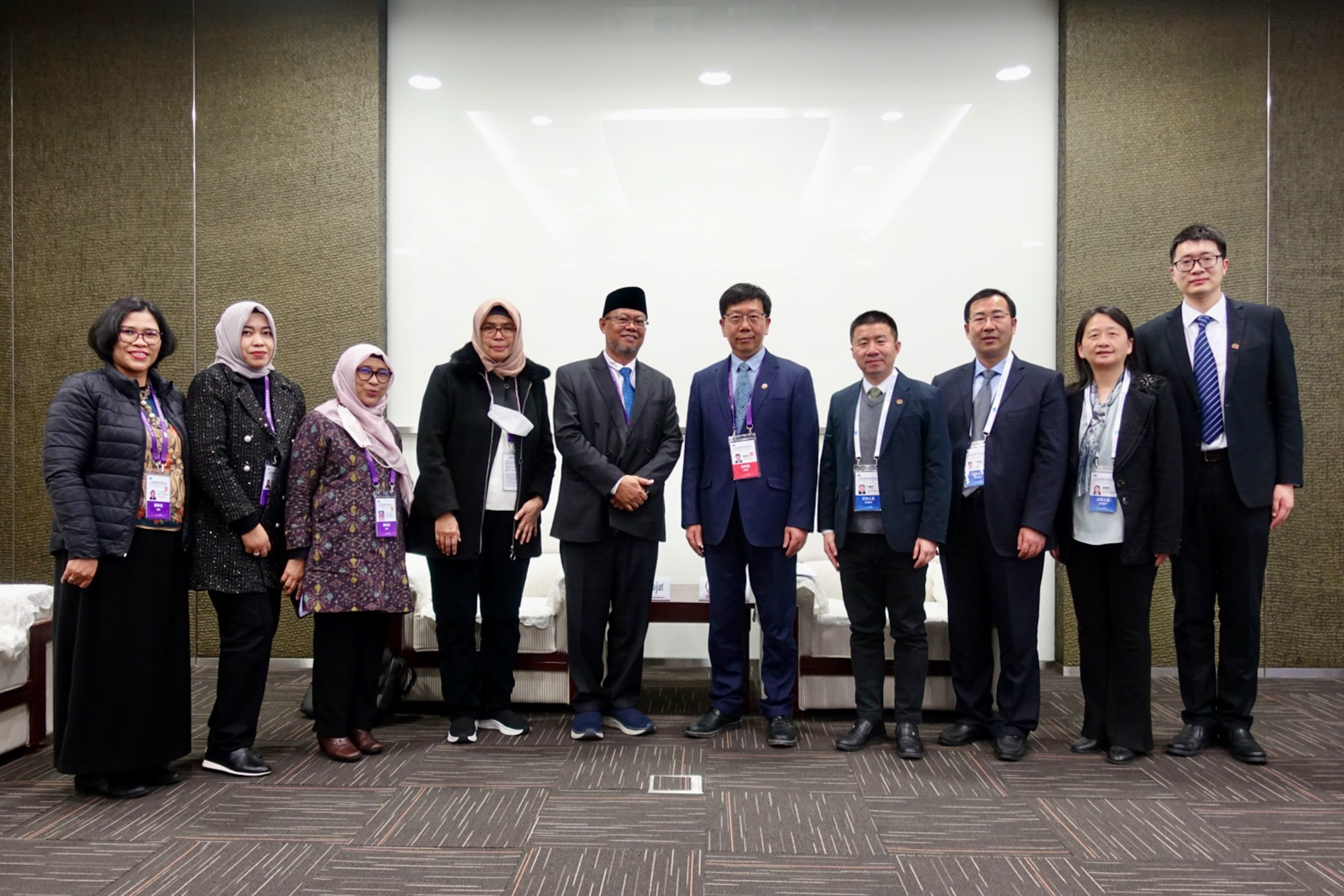 钱旭红与亚洲开放大学协会主席、印度尼西亚特布卡大学校长Ojat Darojat会面交流,出席本场会谈的该校代表团成员有教育学院院长Ucu Rahayu、副院长Isti Rokhiyah、副院长Lidwina Sri Ardiasih、校长助理Maya Maria。