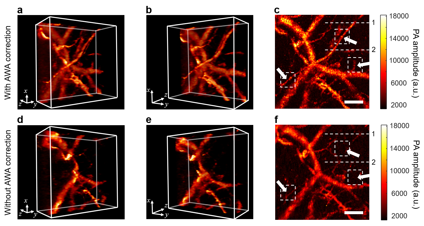 针对当前研究状况,张诗按教授和沈乐成教授团队开发了一套新型的波前自适应光声显微成像系统。该系统利用声学反馈来校正光声成像中由组织引起的光学像差。具体而言,系统通过使用贪婪算法动态地逐点优化在空间光调制器上显示的相位图,对组织引起的像差进行了点对点的动态补偿。在对活体斑马鱼胚胎和小鼠耳朵进行成像时,该系统能够有效地纠正组织引起的像差,显著改善图像质量,并揭示传统光声显微无法识别的微结构。研究团队期待该搭载波前自适应模块的光声显微系统在活体成像领域发挥作用,成为准弹道光区域内无标记光学成像的重要工具。