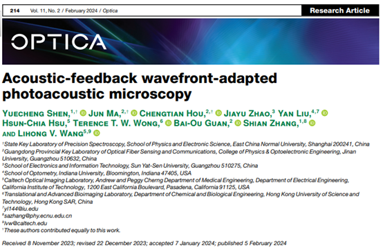永利皇宫登录官网精密光谱科学与技术国家重点实验室张诗按教授和沈乐成教授团队在光声显微成像领域取得重要进展。针对光声显微中由于光学像差而导致的成像分辨率降低的问题,该团队研发出一种自适应光学技术,能够有效地校正这些像差从而恢复成像分辨率。通过利用超声信号作为反馈机制,他们成功地实现了对活体样本(如斑马鱼和小鼠耳朵)的三维成像,在纠正生物组织不均匀引起的光学像差方面表现出显著的效果。相关成果于2月5日以 Acoustic-feedback wavefront-adapted photoacoustic microscopy 为题在 Optica 在线发表。