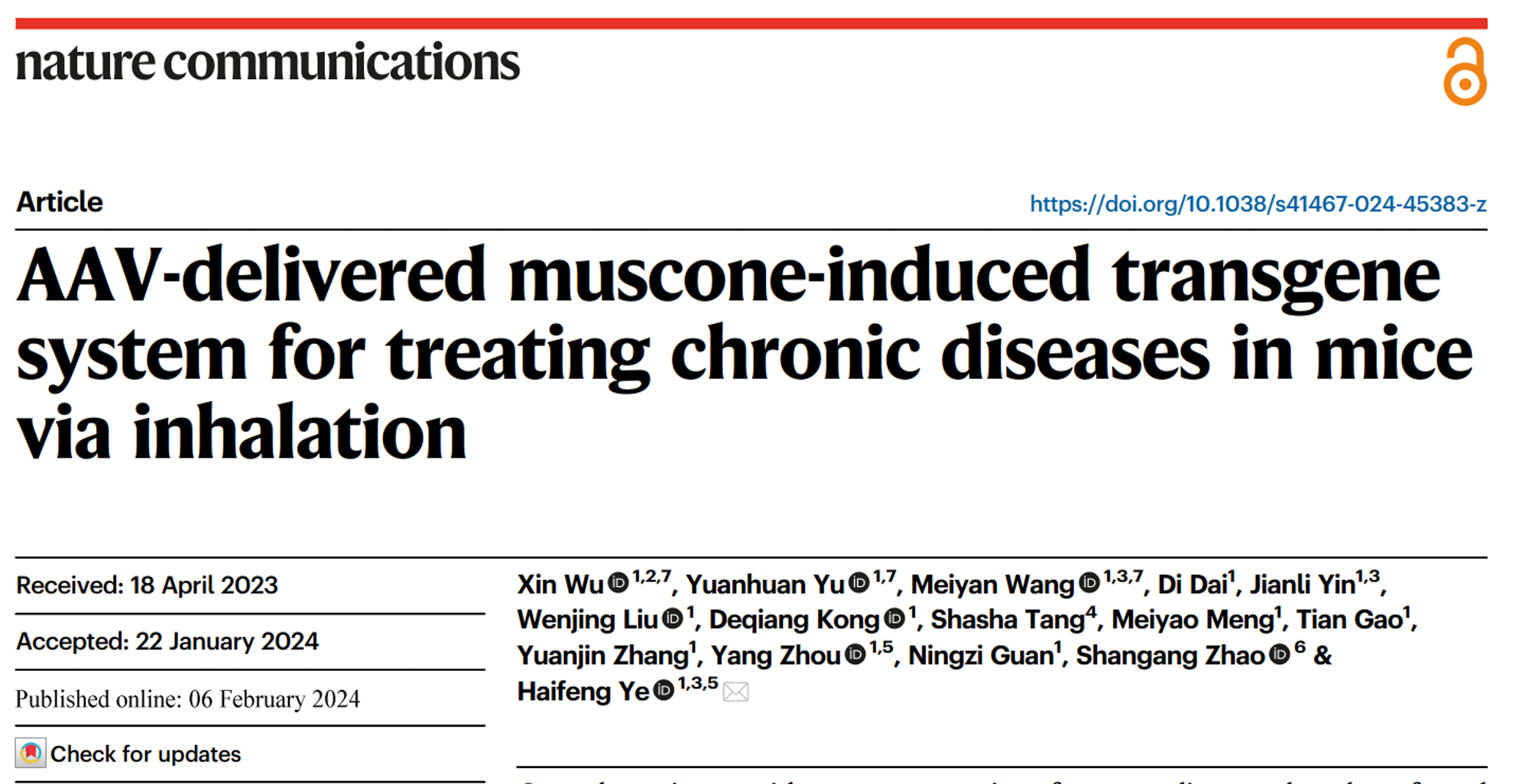 永利皇宫登录官网生命科学学院叶海峰研究团队成功开发了“香气分子”麝香酮(muscone)调控的基因表达精准控制系统,并将其装载在腺相关病毒AAV基因治疗载体中(命名为AAVMUSE),实现无针无痛、患者依从性高的可控式基因疗法。这一创新成果“AAV-delivered muscone-induced transgene system for treating chronic diseases in mice via inhalation”于2024年2月6日发表在国际期刊 Nature Communications。