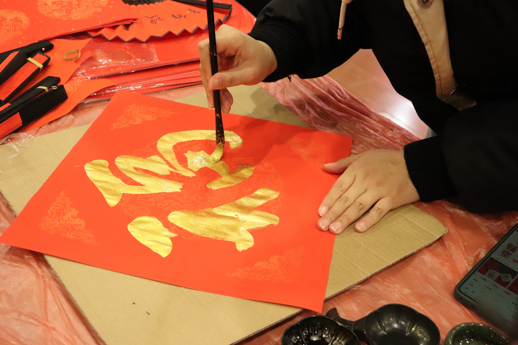 化学与分子工程学院举办了“书香辞旧岁,翰墨迎新春”师生活动。活动现场,墨香四溢,到场师生一同开笔并练习执笔手法后,便迫不及待地投入春联和福字的书写,用笔墨勾勒出一撇一捺,写下心中的一字一句,有对未来一年的美好祝愿,有对科研毕业的满心期待,还有对健康快乐的美丽祝福,处处洋溢着喜庆祥和的欢乐气氛。