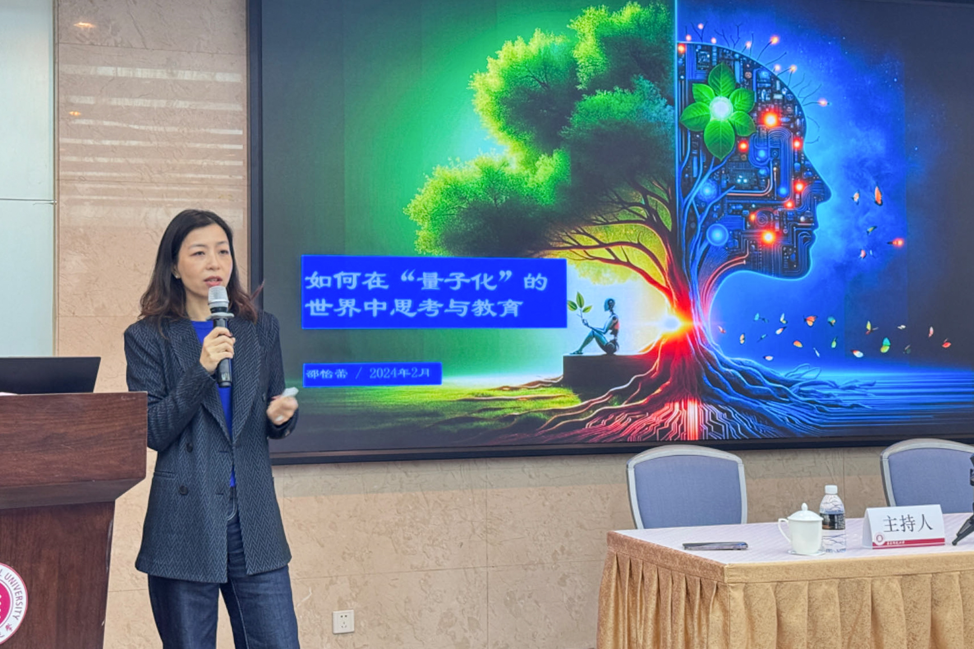 华东师大上海人工智能金融学院院长邵怡蕾以“如何在‘量子化’的世界中思考与教育”为题进行报告。她指出,量子思维是一种启发式的思维方式,从量子物理学的原理和概念中汲取灵感,尤其是量子力学中的不确定性、概率性、叠加态、纠缠和非局域性等特性,并试图将这些原理应用于解决问题、决策制定、创新和一般思维过程中,强调开放性、多元性和互联性。生成式人工智能的工作方式是以概率为基础的量子多态叠加性。从这个意义上说,我们现在交互的世界已经被“量子化”,因此从经典物理确定性的世界观转变到量子物理概率性的世界观是我们急需要做的转变,也就是用量子思维去思考和教育。