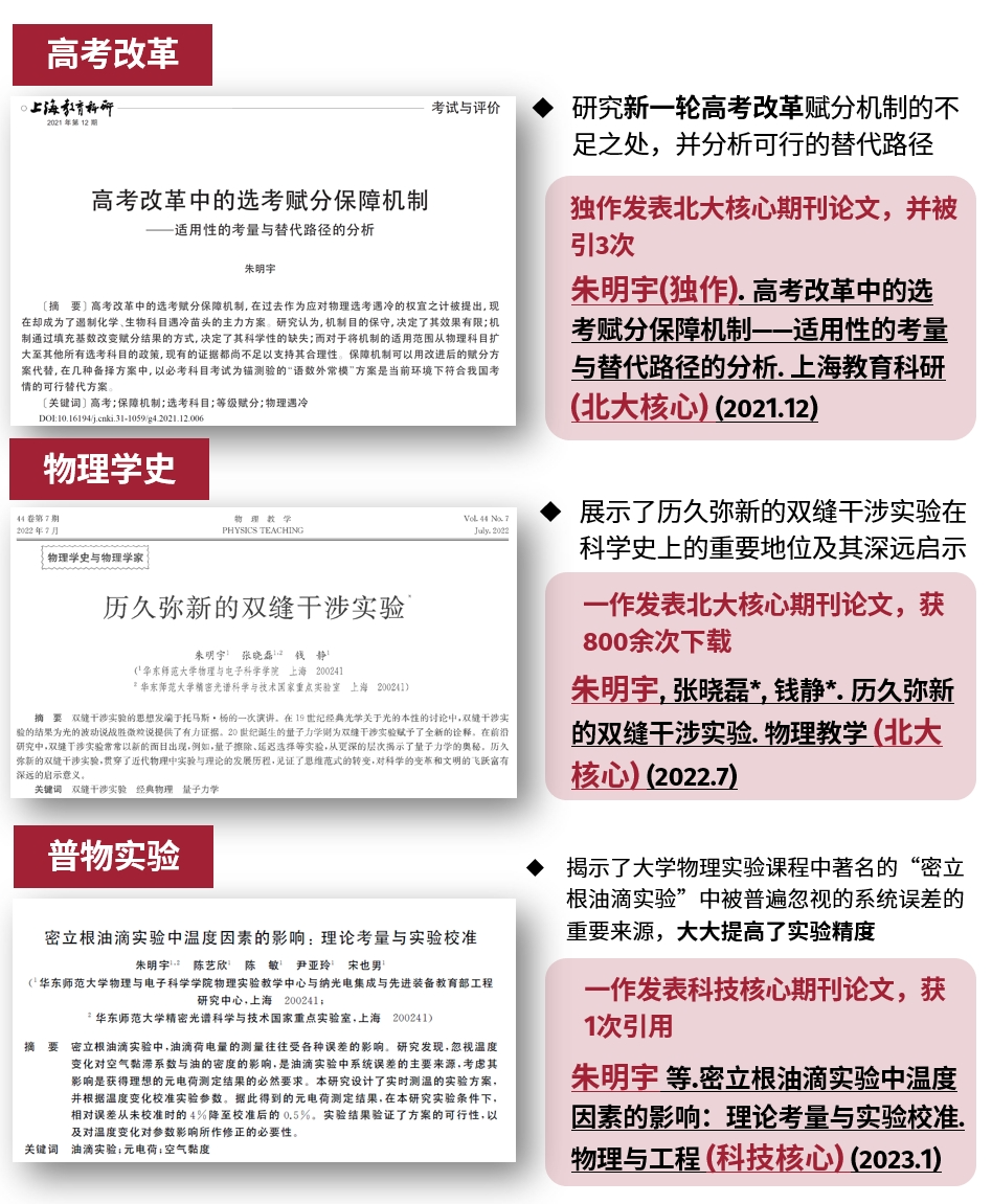 在教育管理、物理学史与普通物理实验领域以第一作者身份发表3篇中文核心期刊论文(其中1篇独立作者)