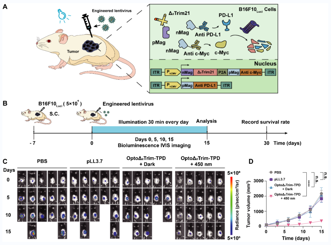 研究人员利用Magnets系统设计了蓝光调控的OptoΔ2Trim-TPD系统,原理与ChemΔ2Trim-TPD一致,他们开发的OptoΔ2Trim-TPD系统可以在30分钟内实现对不同半衰期、不同分子量的靶蛋白的快速降解。最后,他们通过慢病毒将OptoΔ2Trim-TPD系统递送到小鼠肿瘤组织。当小鼠暴露在每天30分钟的蓝光下时,OptoΔ2Trim-TPD系统使肿瘤细胞中靶蛋白(PD-L1和c-Myc)降解,从而抑制肿瘤生长,显著延长了小鼠生存期(图5)。