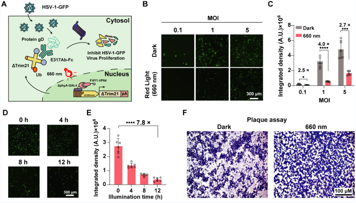 为了实现对靶向蛋白降解的精准可控,他们通过红光诱导的REDMAP系统来调控ΔTrim21的表达,开发了红光调控的靶向蛋白降解系统—RedΔTrim-TPD。他们将感染HSV-1-GFP病毒的细胞转染RedΔTrim-TPD后,成功使用红光触发降解系统在12 h内降解病毒包装蛋白gD以抑制HSV-1病毒增殖(图3)。