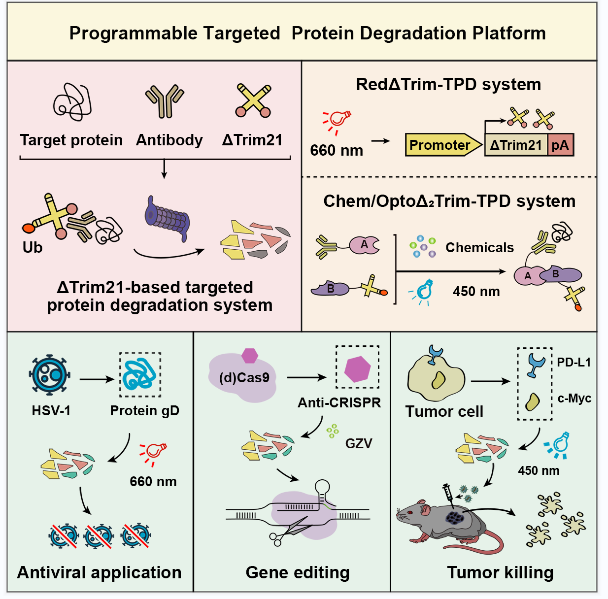 总之,研究人员开发的基于ΔTrim21的可控靶向蛋白质降解系统进一步拓展了蛋白质降解领域的研究,提供了一种快速、高效、可控的胞内蛋白和跨膜蛋白靶向降解手段,为细胞生物学基础研究提供了强大的工具,并有望推进基因和细胞的精准治疗。