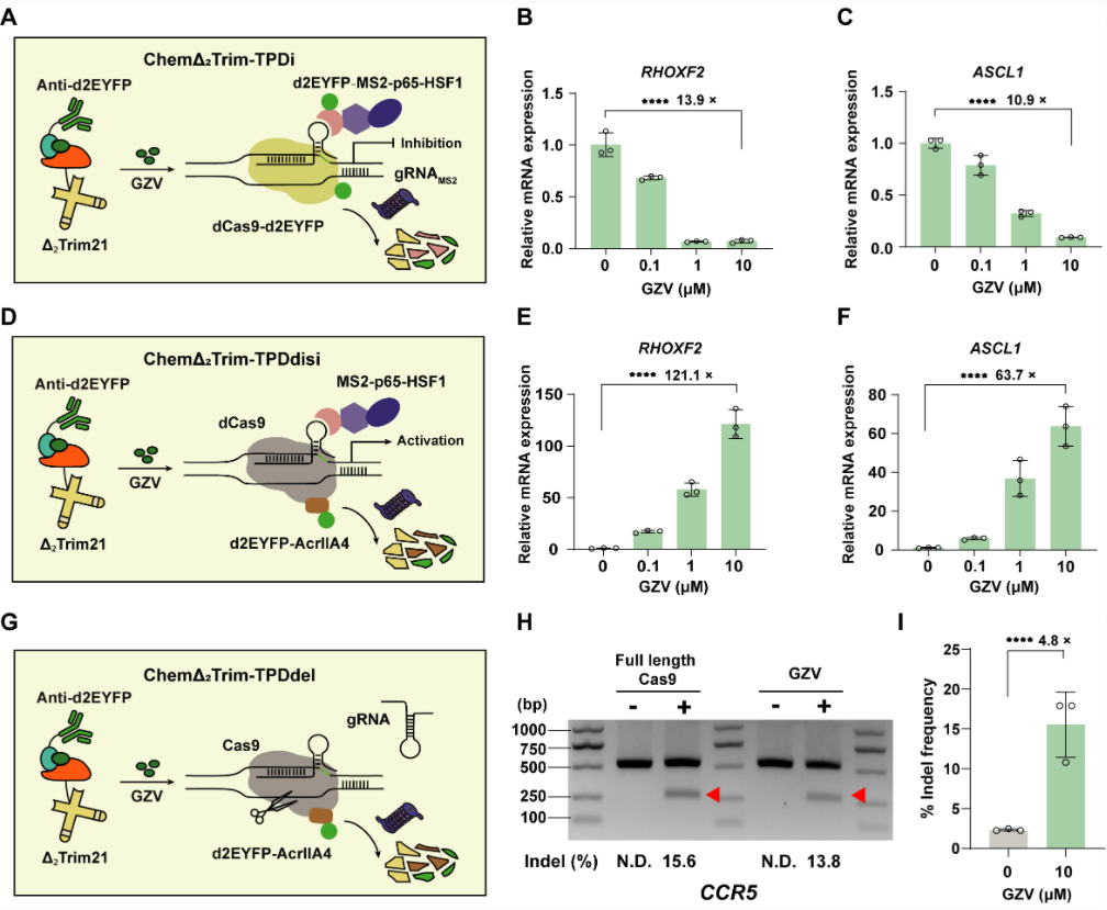 为了实现分钟级别高效诱导蛋白降解,他们开发了化学诱导的翻译控制蛋白降解(ChemΔ2Trim-TPD)系统。当药物存在时,纳米抗体和ΔTrim21被聚合在一起,在30分钟内实现药物控制的靶向蛋白降解。基于此,他们将其应用于控制基因编辑,设计了三种ChemΔ2Trim-TPD介导的CRISPR-Cas9系统:转录抑制、转录去抑制或基因片段删除,用于控制人类细胞中不同的感兴趣基因(图4)。