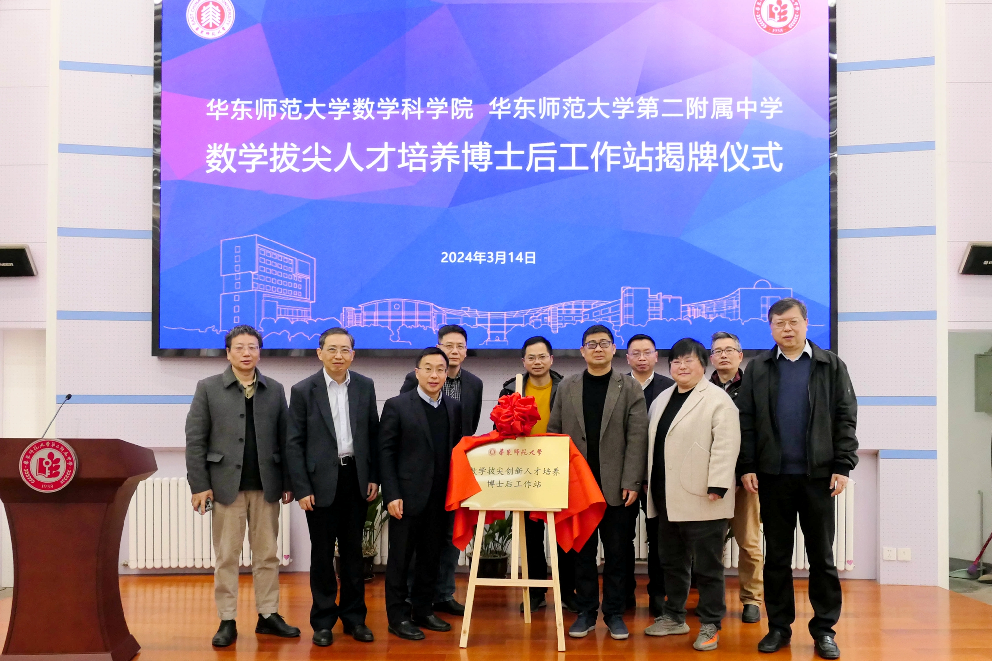 3月14日,在华东师大数学科学学院成立6周年之际,华东师大数学科学学院与华东师大第二附属中学“数学拔尖人才培养博士后工作站”正式揭牌。华东师大数学科学院院长吕长虹、党委书记贾挚、博士生导师熊斌教授参加揭牌仪式,华东师大第二附属中学校长周彬、党委书记袁军以及数学骨干教师、丘成桐少年班学生等参加活动。活动由华东师大第二附属中学王平副校长主持。