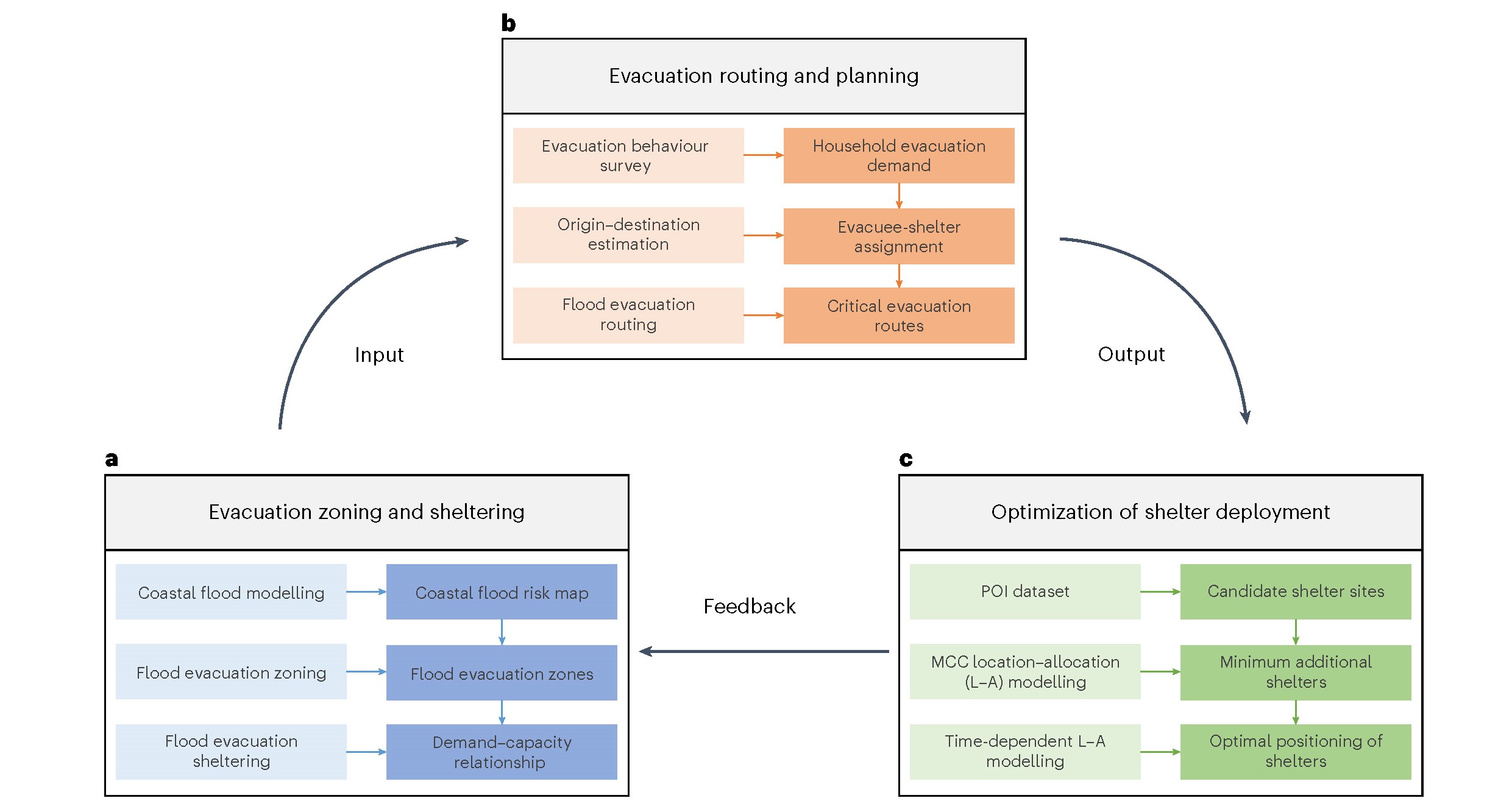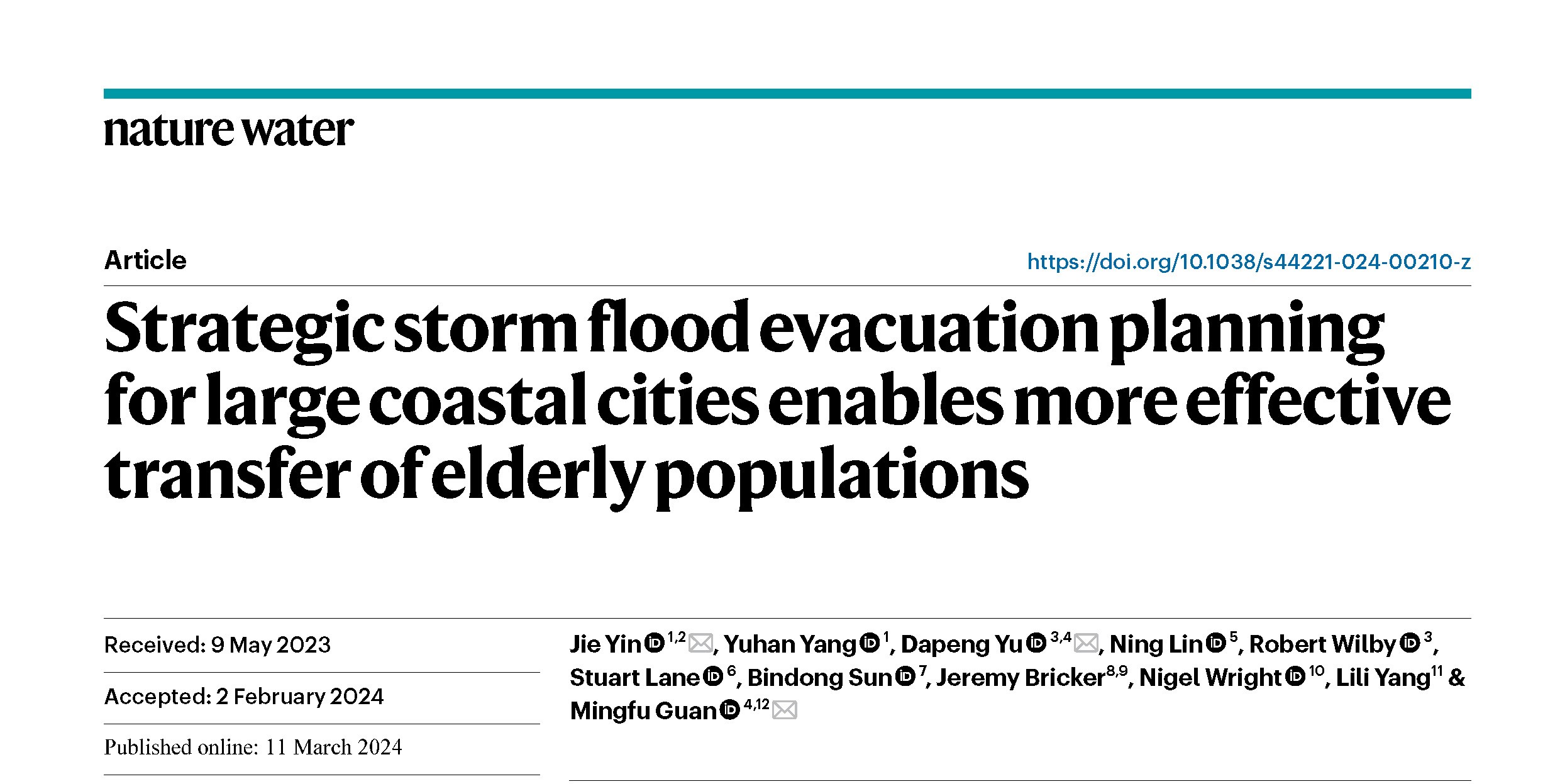 永利皇宫登录官网地理科学学院殷杰教授研究团队在沿海城市洪涝灾害应急疏散战略规划方面取得重要进展。该研究专注于提高沿海城市老年人群的风暴洪水应急疏散效率,通过对上海和纽约两个典型沿海大城市的对比分析,发展了一种结合应急疏散区划、疏散路径规划和避难场所优化为一体的应急疏散战略规划体系,可为全球沿海城市风暴洪水应急预案编制和管理决策提供重要的参考依据。相关成果以 Strategic storm flood evacuation planning for large coastal cities enables more effective transfer of elderly populations 为题于2024年3月11日在线发表于 Nature Water, 永利皇宫登录官网为论文的第一完成单位,殷杰教授为论文第一作者和共同通讯作者。