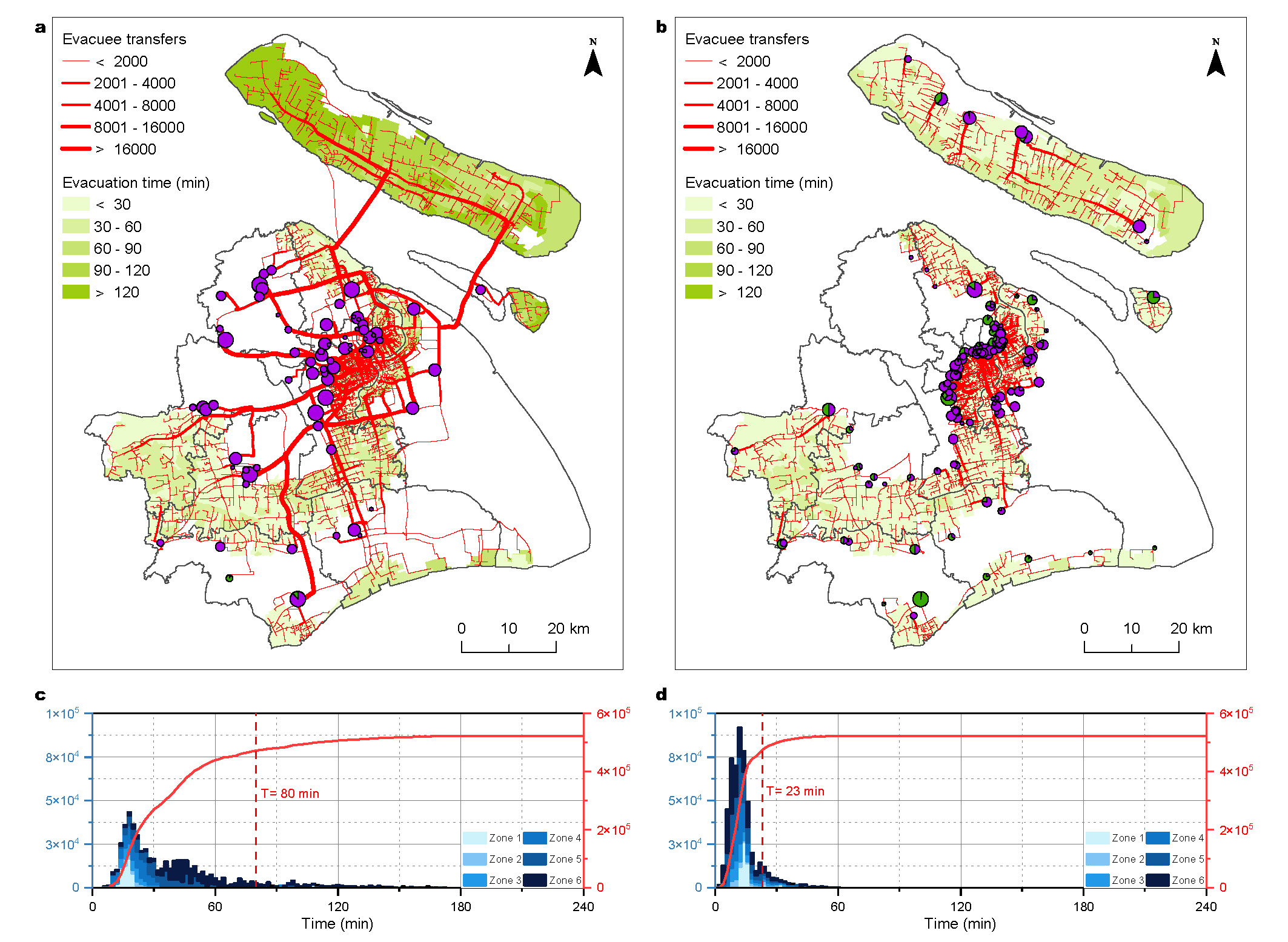 研究结果揭示了上海市和纽约市在应急疏散行为和策略上的显著差异(图2,图3)。98%的上海居民愿意响应政府的疏散指令、74%的选择前往政府指定的避难场所、82%的老年人需要政府提供的应急疏散援助,而纽约市仅有约1/3的居民在桑迪飓风期间遵照指令离开疏散区、其中2%的居民选择待在疏散中心避险。在此基础上,依据两个城市6个应急疏散区内总人口和老年人口数,以及现有避难场所布局和容量发现,纽约市现有避难场所可以满足紧急状况下的疏散安置需求,且绝大多数人可以在较短时间内有序转移,而上海市现有应急避难场所配置和风暴洪水疏散需求存在一定的空间错配,难以满足脆弱人群的避难需求并可能导致整体疏散时间大幅延长。两种避难场所优化方案可以满足当前上海市风暴洪水应急疏散的供需矛盾,优化方案二在疏散效率和公平性方面明显胜过优化方案一。优化方案二通过在上海市中心城区周边以及崇明岛等关键区域部署避难所,分摊主要疏散路径通量,有效缓解了长距离疏散的交通压力,使90%的避难人员在基线交通条件下的旅行时间显著减少,应急疏散效率较优化方案一提升了三倍以上(图4)。