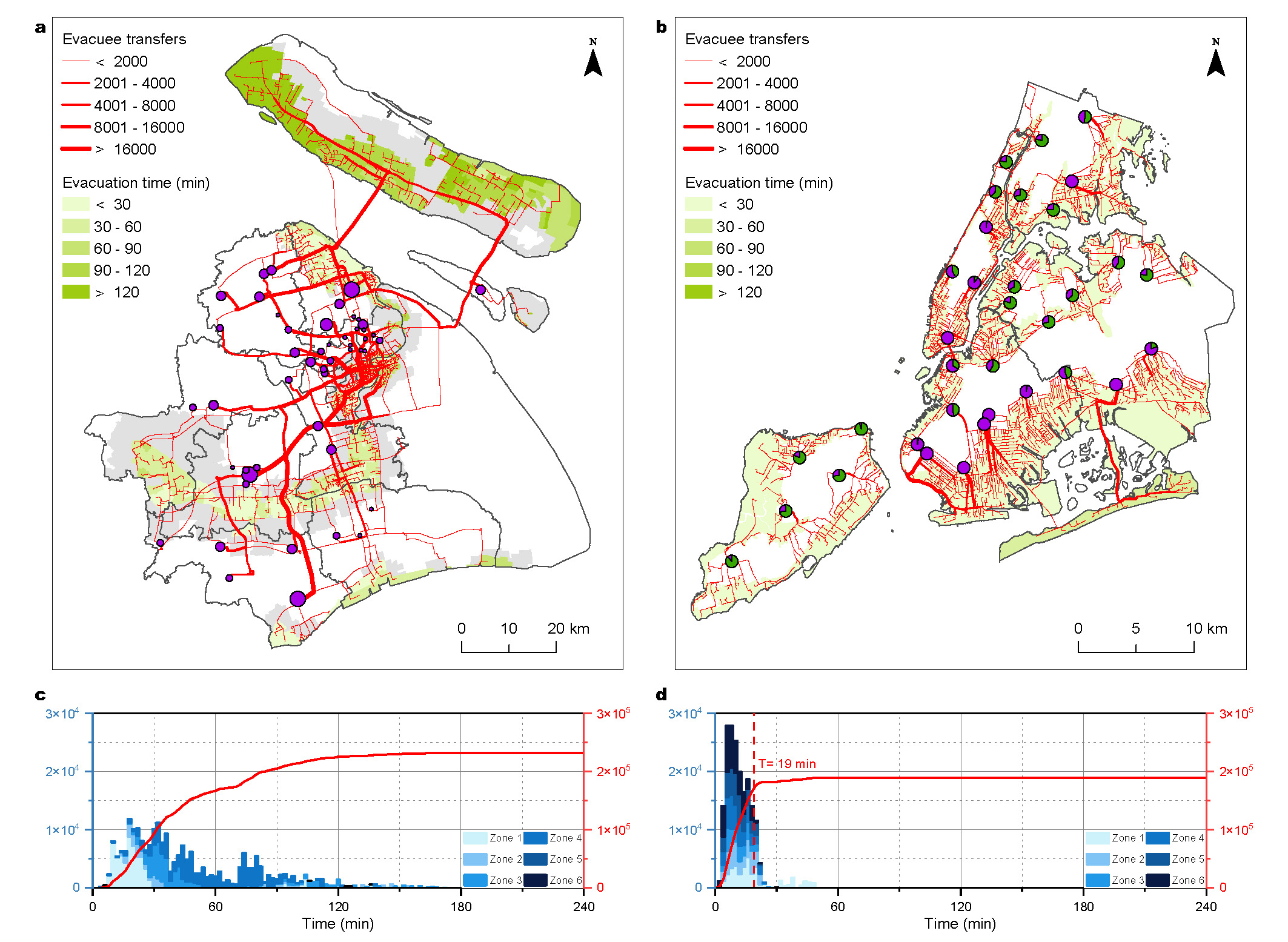 图3 上海和纽约市风暴洪水疏散路径通量(人数)和疏散时间对比